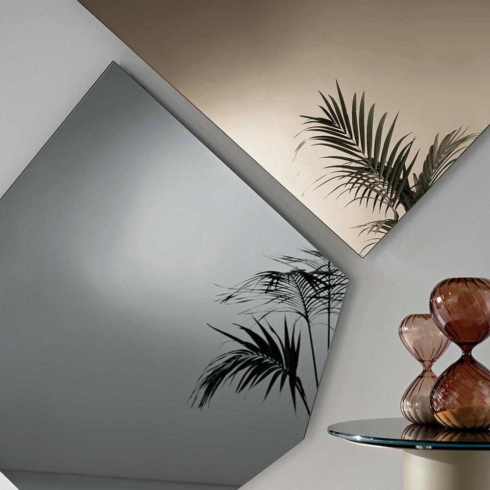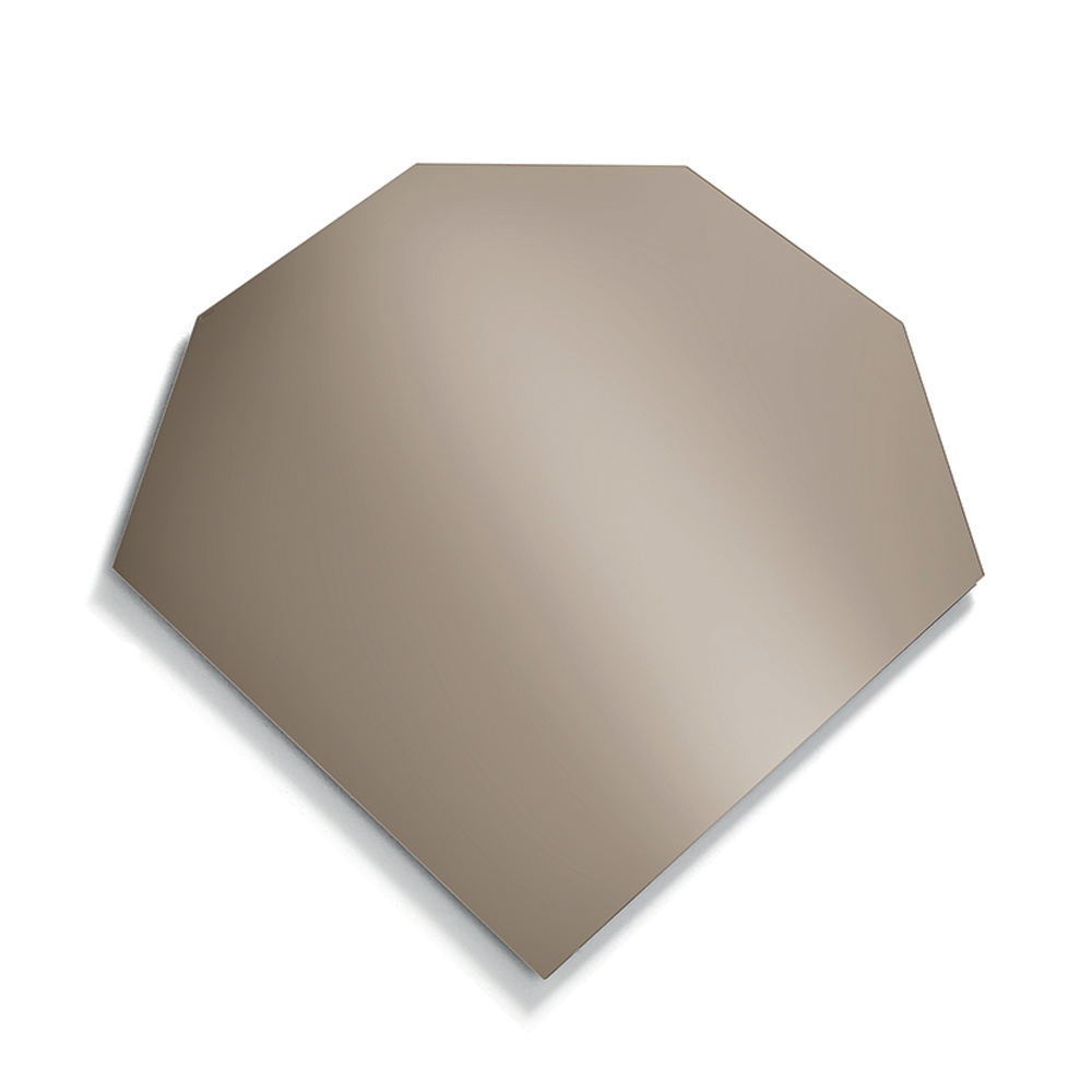 Der Spiegel ist in verschiedenen Größen erhältlich und kann einzeln oder in Kombination mit anderen Spiegeln verwendet werden, um raffinierte geometrische Effekte an der Wand zu erzielen. Die eleganten Oberflächen in Bronze und Rauchgrau verleihen der Spiegelfläche Tiefe und Wärme.