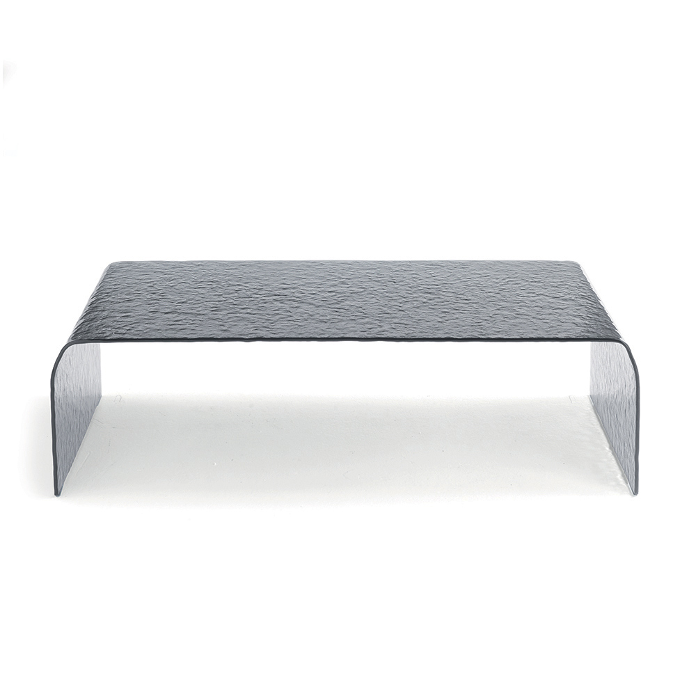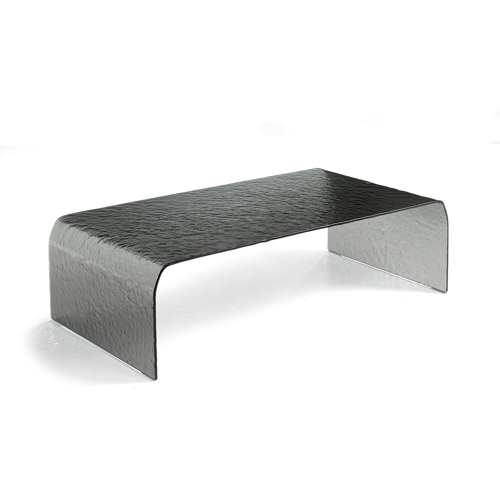 Dieser aus einer einzigen gebogenen Klarglasscheibe gefertigte Couchtisch besticht durch seine edle, gehämmert wirkende Oberfläche , die ein subtiles Spiel von Reflexionen und Tiefe erzeugt. Die nahtlose, durchgehende Form unterstreicht die Reinheit des Materials und macht den Tisch zu einem wahrhaft skulpturalen Objekt.