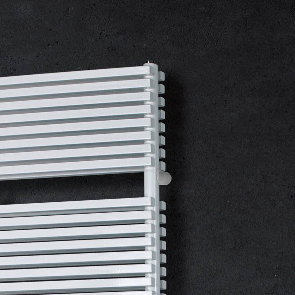 Hybrid-Handtuchwärmer aus Kohlenstoffstahl mit rein glänzender weißer Oberfläche, bestehend aus einer doppelten Reihe horizontaler Elemente mit einem quadratischen Querschnitt von 2 cm, die an vertikale Verteiler mit einem Durchmesser von 3,5 cm geschweißt sind, vollständig in Italien hergestellt , mit Wandbefestigungssatz, Entlüftungsventil und Jalousie Stecker im Lieferumfang enthalten .