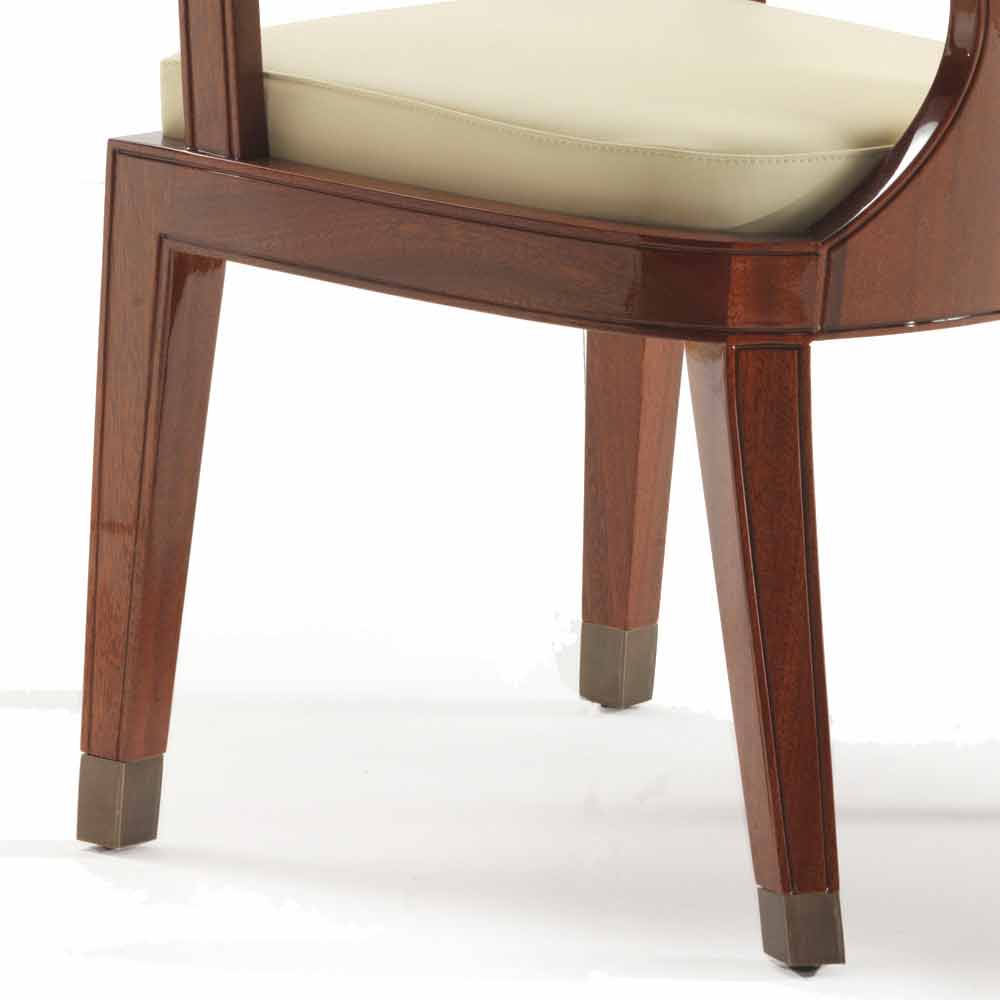 Die Vorderseite des Rückens ist aus glattem Holz, während die Rückseite aus bearbeitetem Holz besteht. Der Sitz ist gepolstert und mit Leder bezogen, die Spitzen sind aus bronziertem Messing. Finish in poliertem Mahagoni.