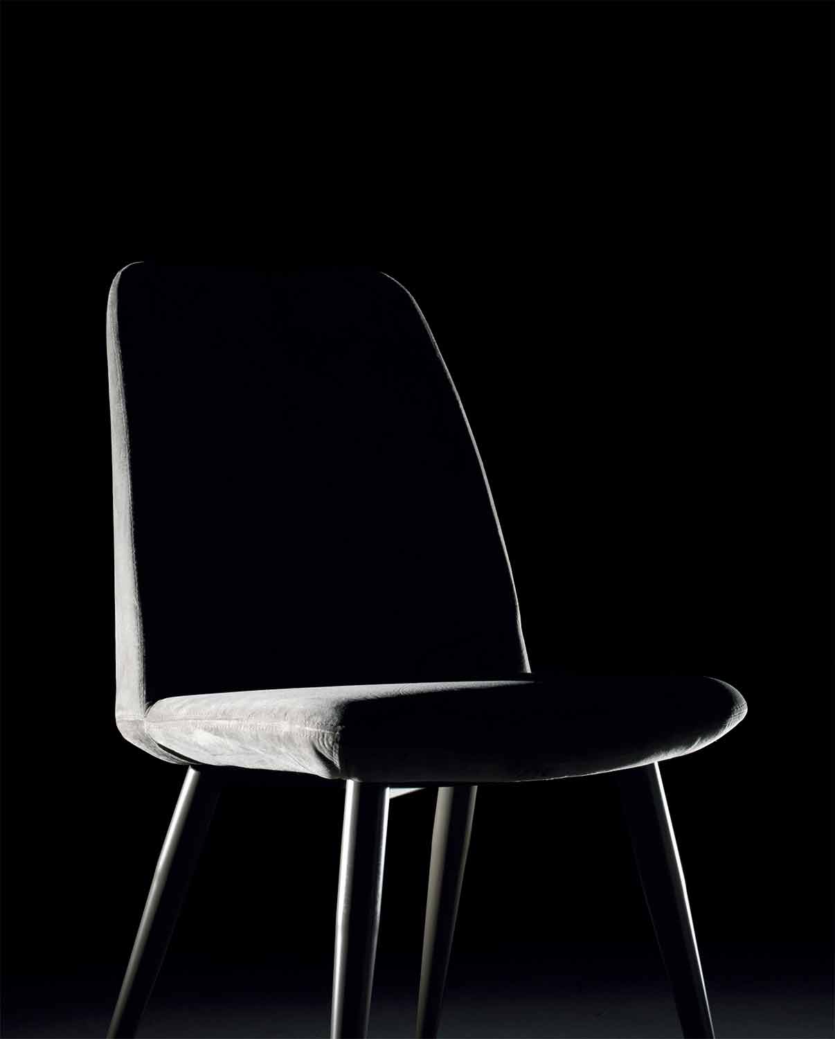 Küchenstuhl im modernen Design mit Untergestell aus graphitlackiertem Stahl und Sitz aus Stoff, Samt oder Leder; handgefertigt in Italien.