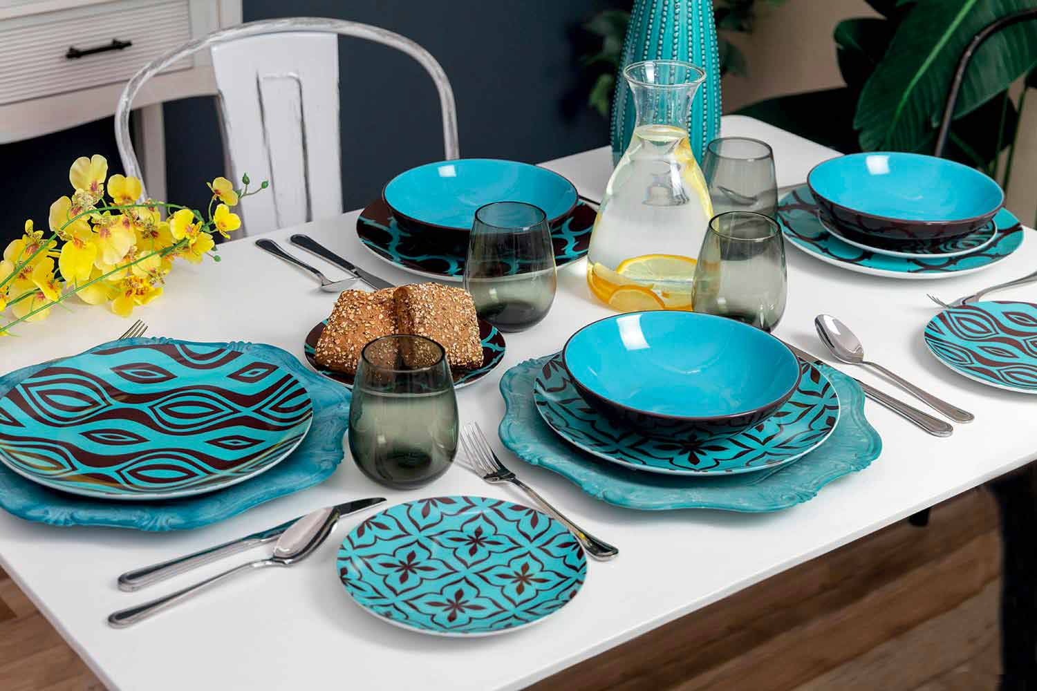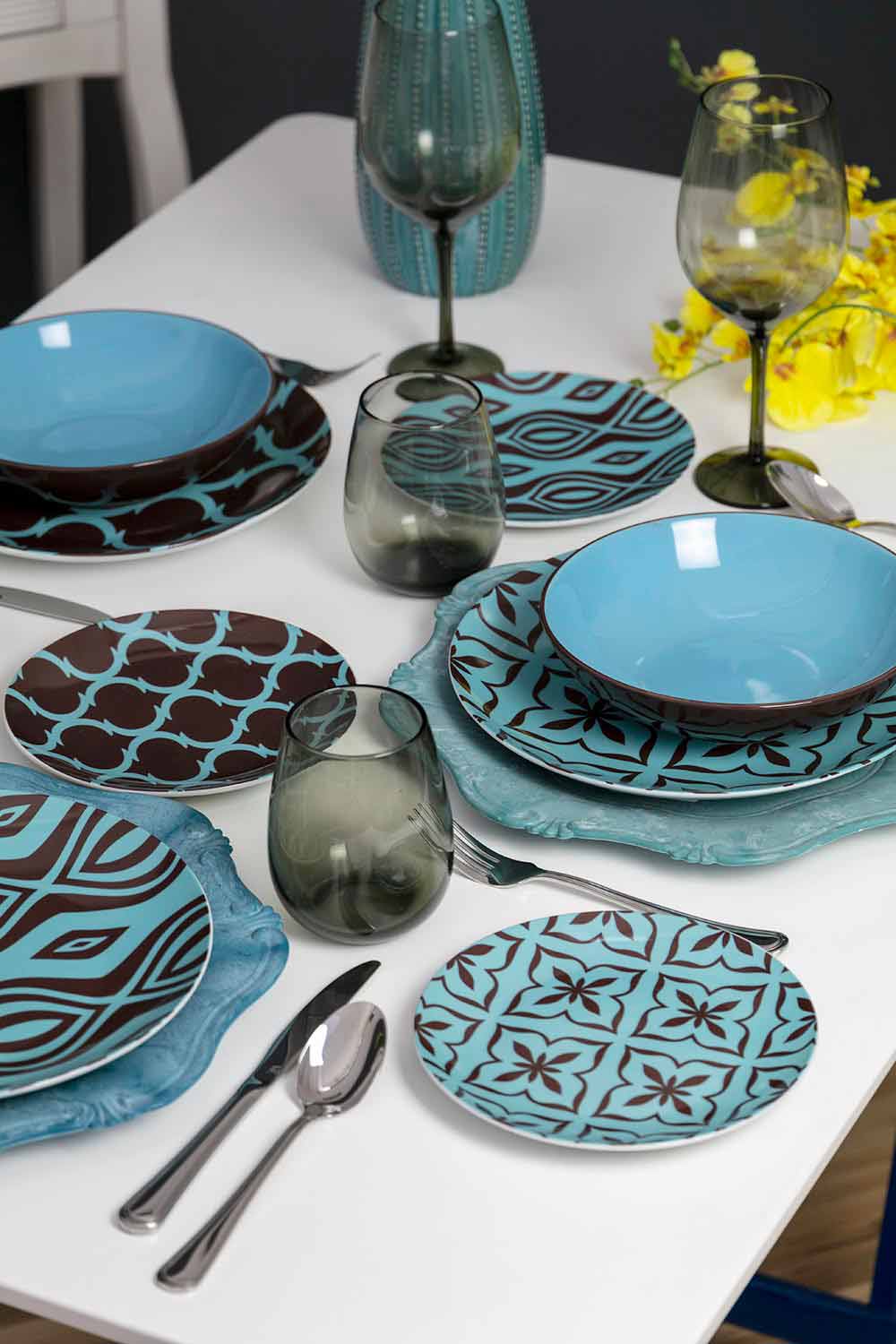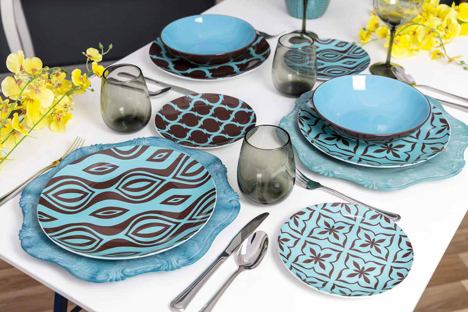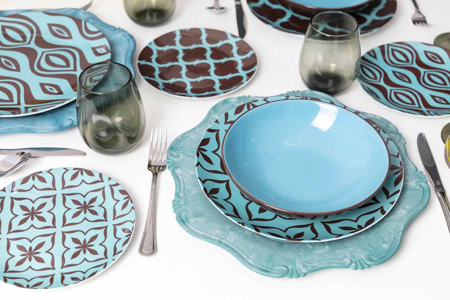 | Maße | Verzierte flache Platte: Durchmesser 27 x h. 3 cm (Gewicht: 666 gr) Feste Suppenteller: Durchmesser 21 x h. 5 cm (Gewicht: 592 gr) Dekorierter Obstteller: Durchmesser 19 x h. 2 cm (Gewicht: 310 g) |