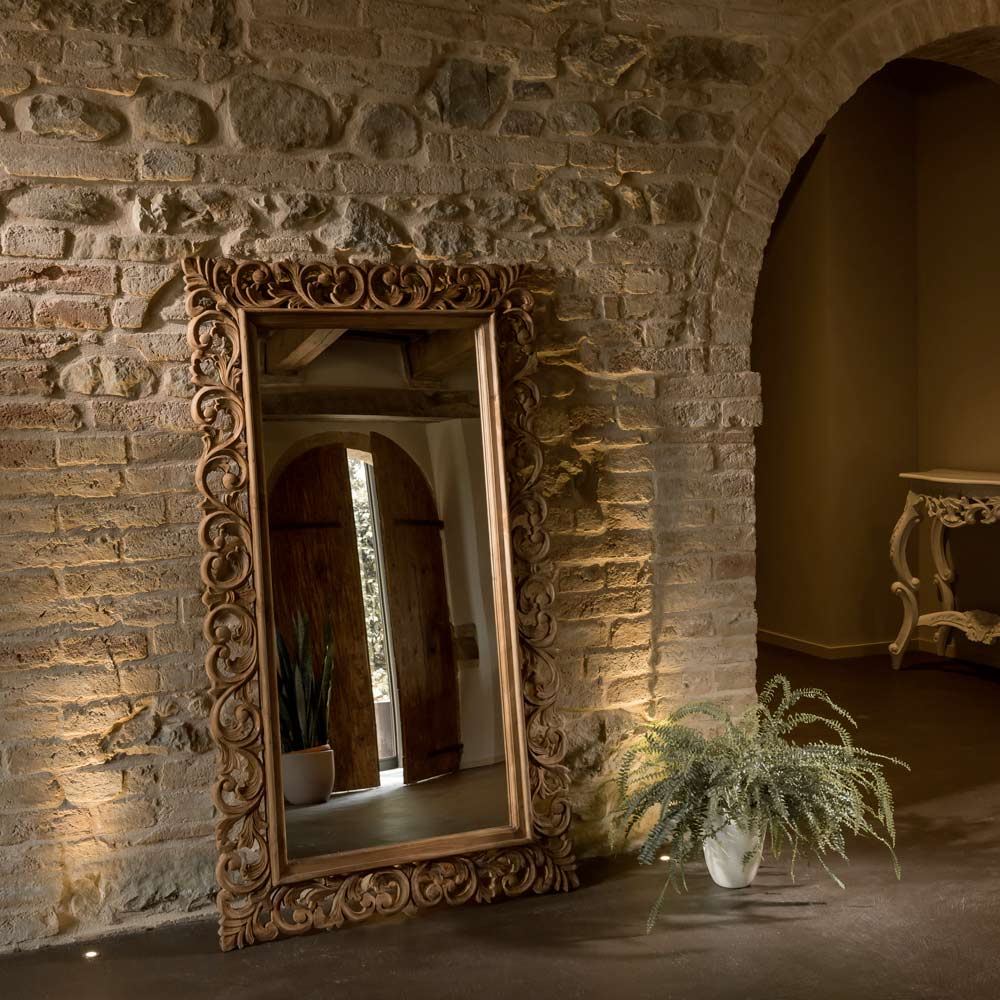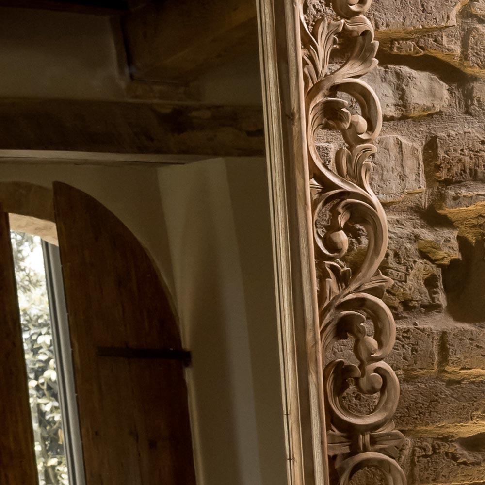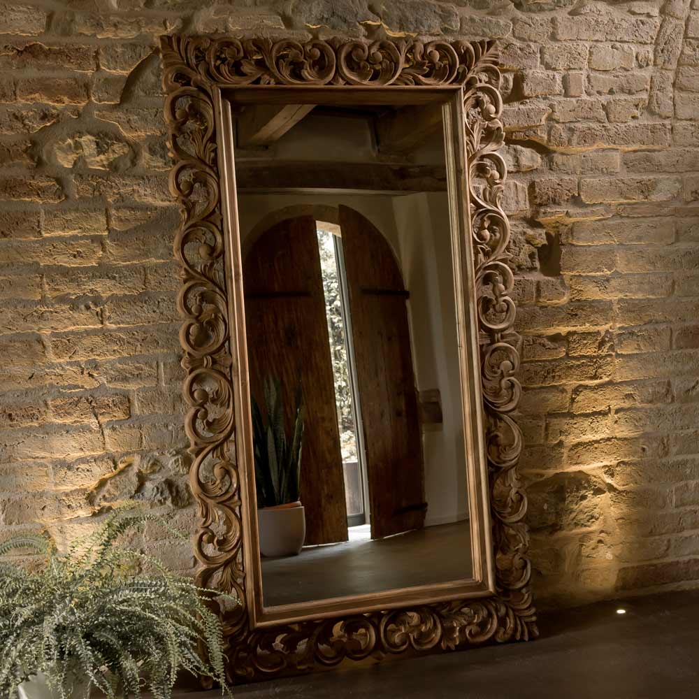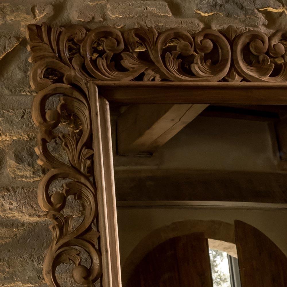 Dieser aus massivem Holz geschnitzte Spiegel ist ein charmantes Dekorationselement, das jedem Raum Eleganz und Persönlichkeit verleiht. Der kunstvoll gestaltete Rahmen, ein Ergebnis handwerklicher Handwerkskunst , verleiht dem Spiegel einen einzigartigen und zeitlosen Charakter.