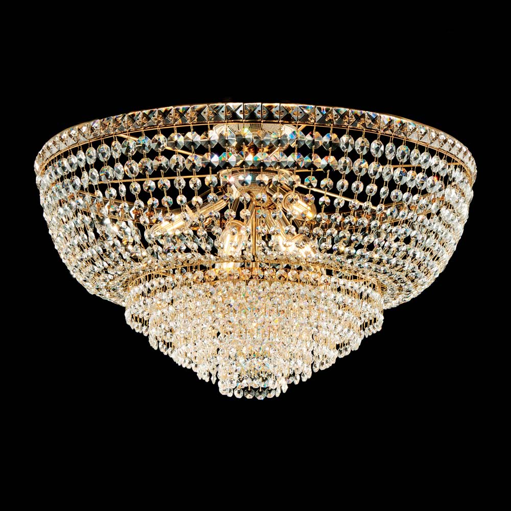 Diese luxuriöse Deckenleuchte aus Eisen und vergoldetem Messing mit Strasssteinen ist raffiniert und zugleich beeindruckend. Sie taucht Räume in ein kostbares, stimmungsvolles Licht. Die elegante Struktur aus konzentrischen Bändern leuchtender Strasssteine erzeugt ein faszinierendes Lichtspiel, das die Decke optisch aufwertet und dem Raum eine edle Atmosphäre verleiht.