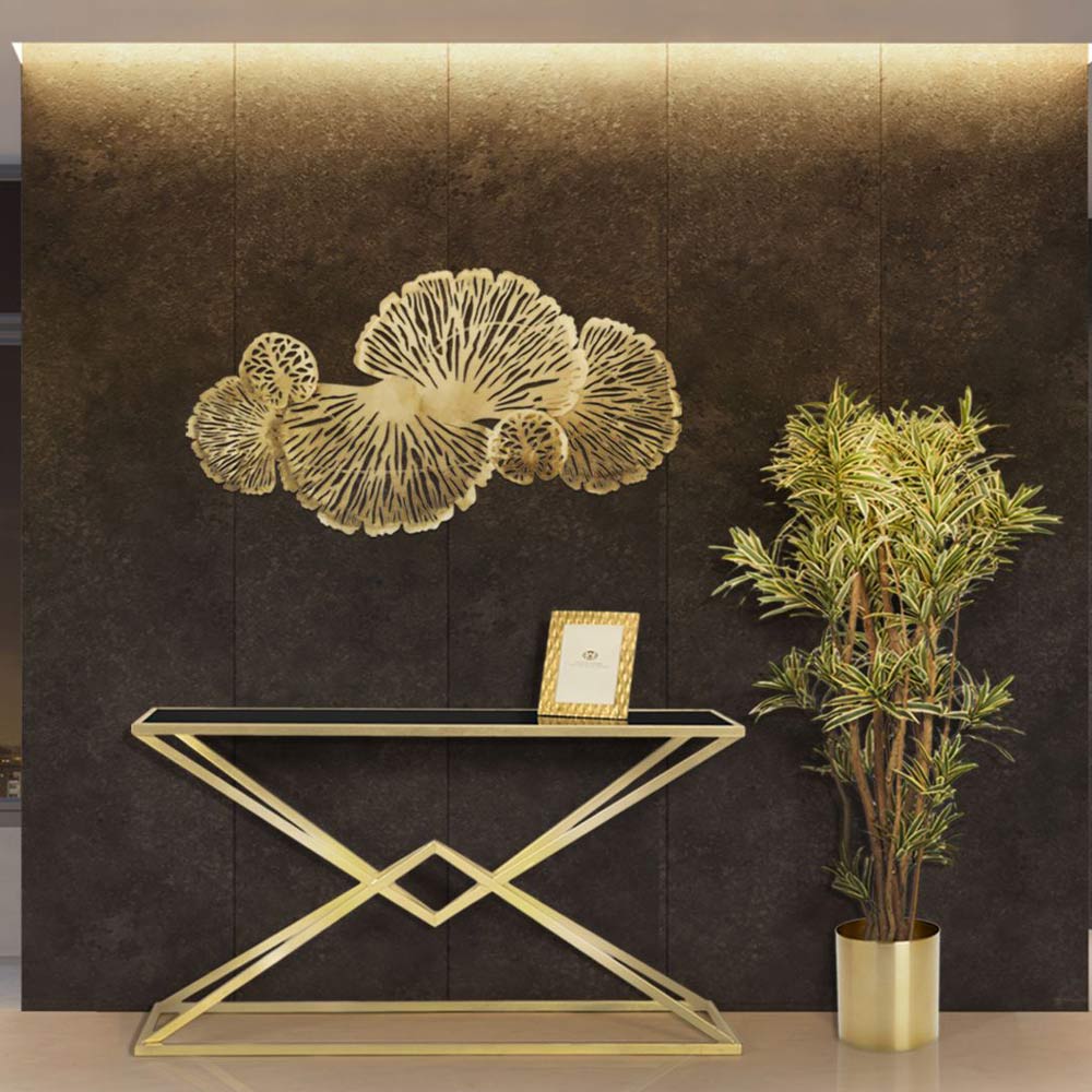 Feste rechteckige Konsole mit Struktur aus Eisen mit Goldfinish mit schwarzer Glasplatte . Eine elegante und stilvolle Einrichtungslösung, die sich durch eine besondere Basis auszeichnet, die geometrische Linien und verschiedene Formen verwendet, um die Ästhetik des Produkts zu bereichern und eine einzigartige und exklusive Note zu verleihen. Das Ergebnis ist eine raffinierte und avantgardistische Konsole , die sich dank ihrer Vielseitigkeit und ihres zeitgenössischen Charakters jeder modernen stilistischen Situation anpassen kann.