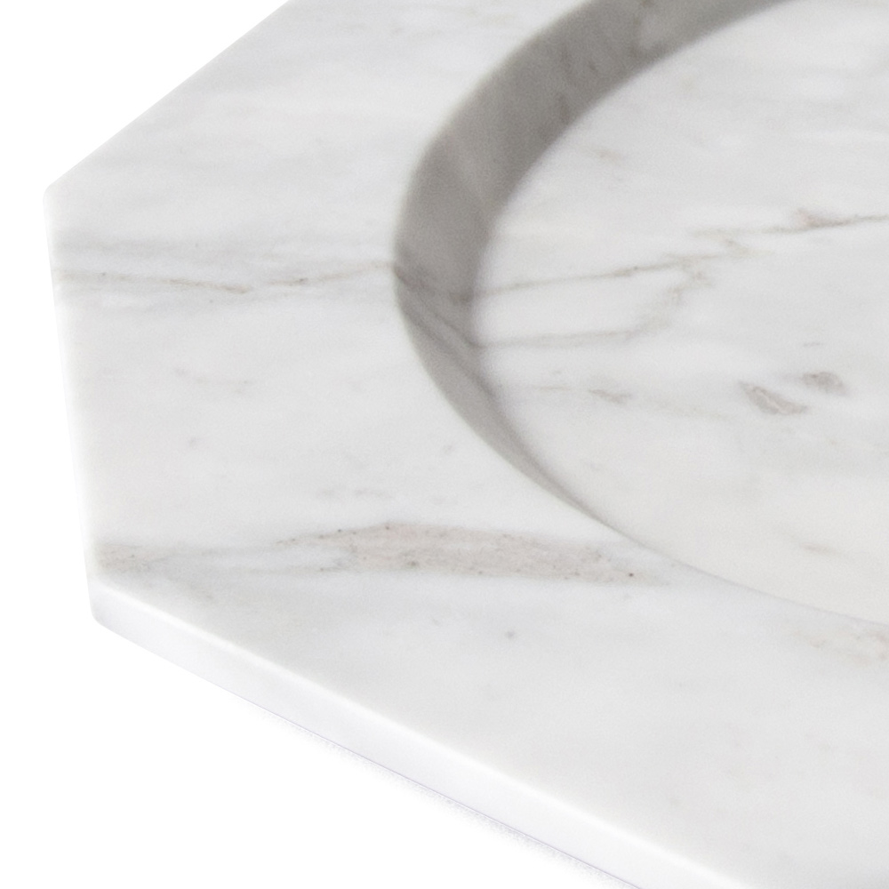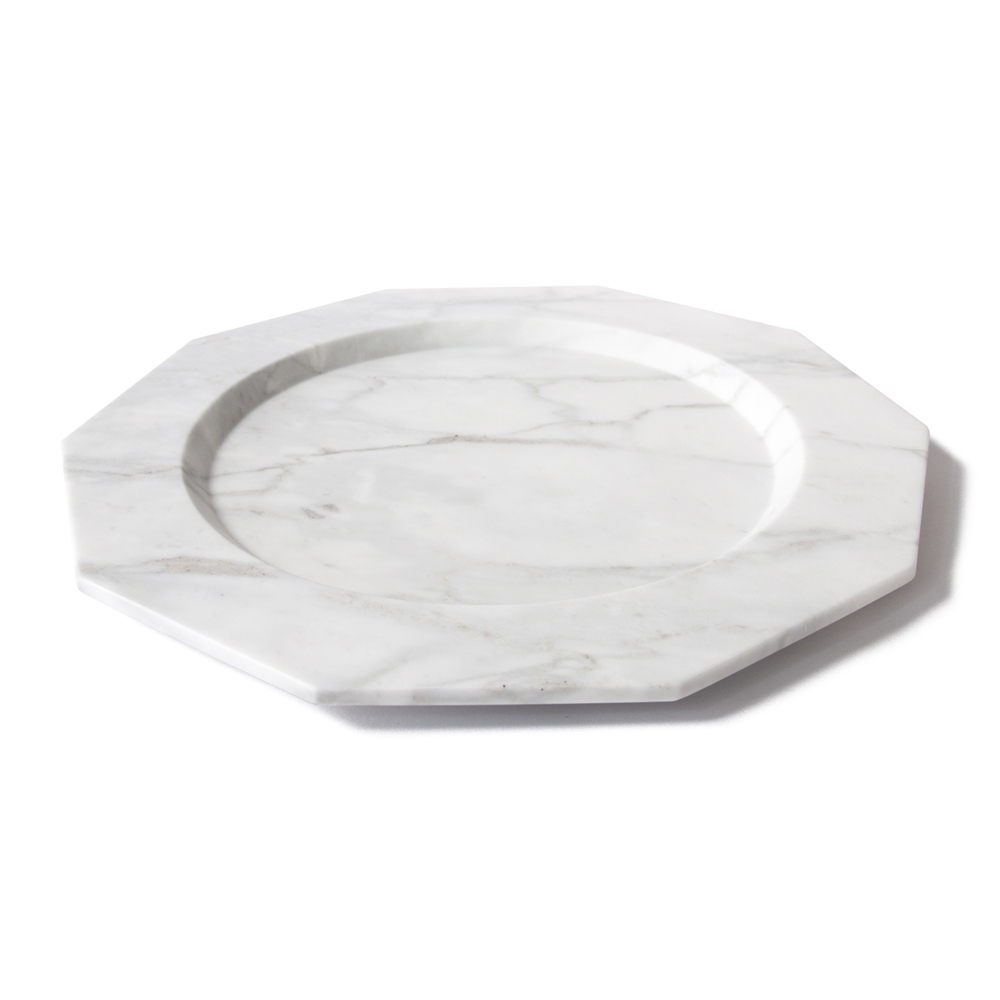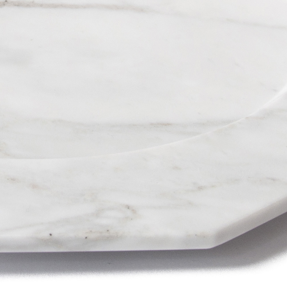 Diese flache Servierplatte zeichnet sich durch ihre zehneckige Form und die Eleganz aus, die sie ausstrahlt und die sie sowohl auf dem Tisch als auch als Dekorationsobjekt verleiht. Ein raffiniertes und raffiniertes Design, das dank seiner Wesentlichkeit, die durch den satinierten Arabescato-Carrara-Marmor, aus dem es hergestellt wird, unterstrichen wird, zum Protagonisten in der Umgebung des Reiseziels werden kann.