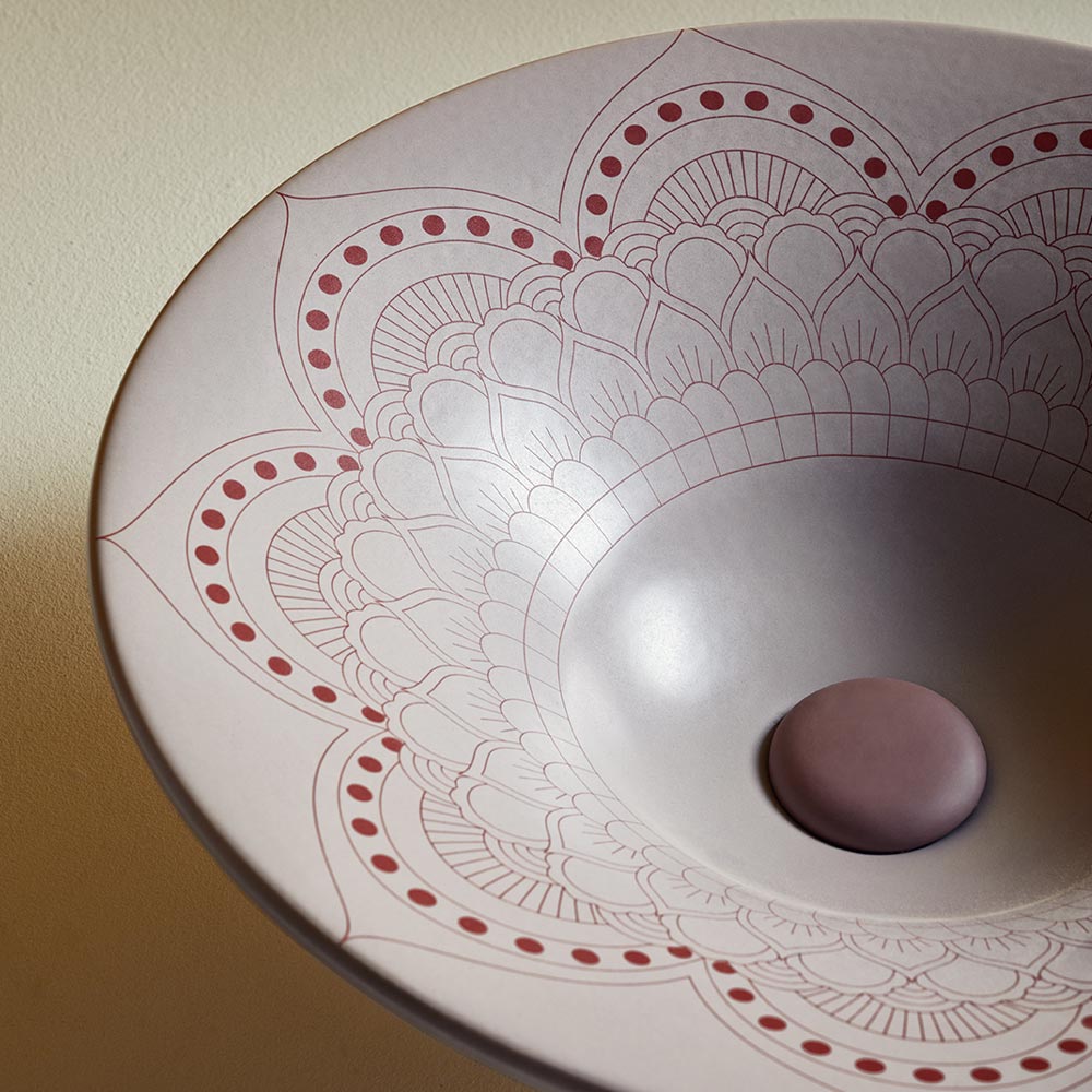 Dank der Möglichkeit, die Dekoration auszuwählen, ist es möglich, auf unterschiedliche Designanforderungen zu reagieren und unterschiedliche Effekte zu erzielen : geometrische Hintergründe, abstrakte Texturen, Designs mit orientalischen Anklängen. Dadurch wird dieses Produkt zu einem echten Möbelstück , das die Badezimmerumgebung vervollständigt und personalisiert und dabei die für Made in Italy typische Funktionalität und Qualität garantiert.