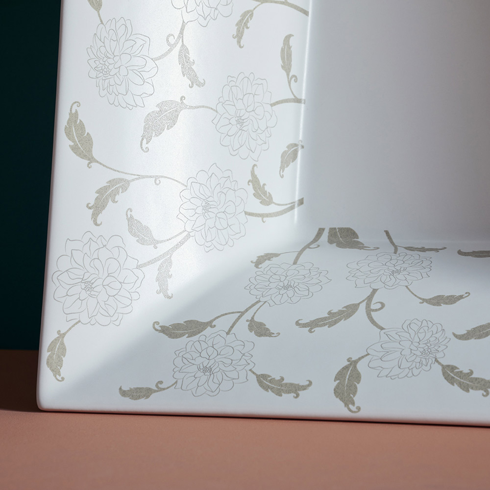 • Innendekor mit Blumenrelief auf mattweißer Emaille, außen mattweißes Email