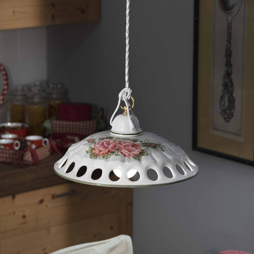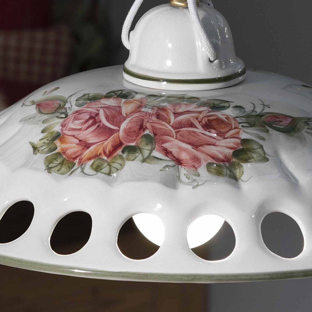 Diese Hängelampe Es besteht vollständig aus Metall und handbemalter Keramik mit Blumendekorationen , die das Können und die Geschicklichkeit der Handwerker unterstreichen.