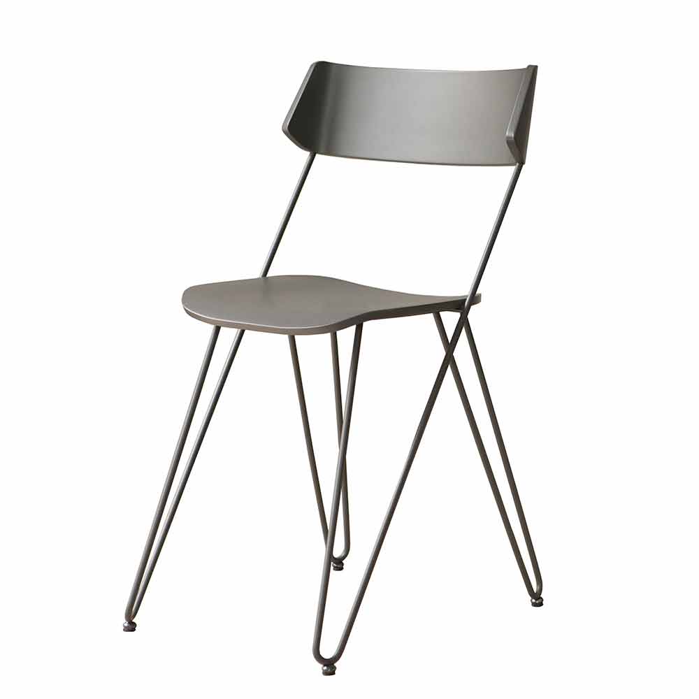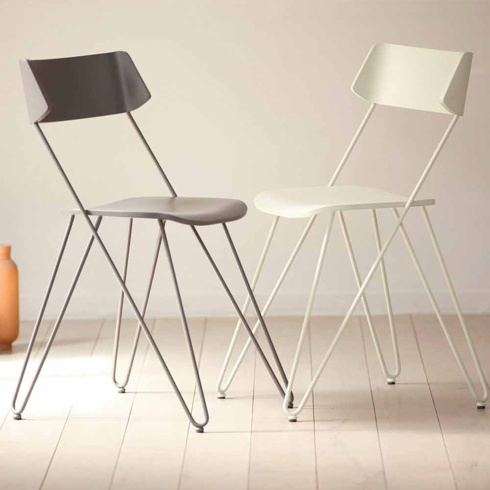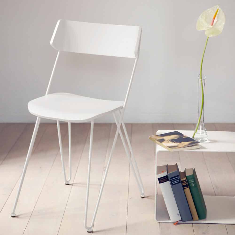 Eine innovative Idee, wenn auch in ihrer Einfachheit. Was die Ästhetik auszeichnet, ist die Besonderheit der röhrenförmigen Beine, die das Gefühl eines Drucks nach oben erzeugen, indem sie den Sitz sanft stützen und die Illusion einer Rückenlehne erzeugen, die zu schweben scheint. Das schlanke Gestell und die Wesentlichkeit der Formen machen ihn zu einem äußerst vielseitigen Stuhl, der die Einrichtung seiner Räume nüchtern und diskret bereichern kann und gleichzeitig eine perfekte Harmonie der Stile und eine warme und einladende Atmosphäre schafft.
