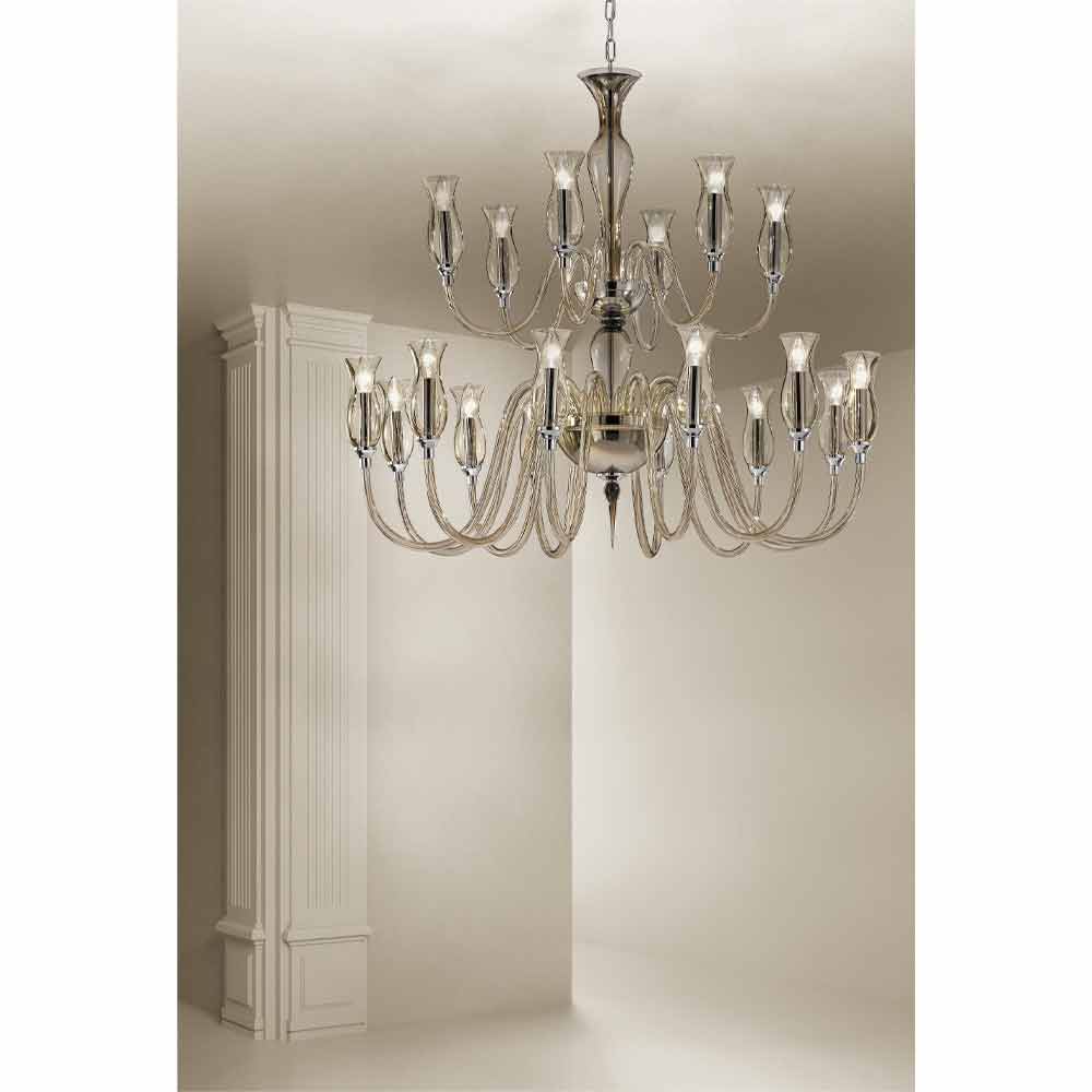 Feiner und filigraner 18-flammiger Kronleuchter aus Venedig-Glas in Rauchoptik mit polierten verchromten Metalldetails , Made in Italy . Aus der Neuinterpretation der klassischen und edlen Glasformen entsteht eine neue Schönheitsformel , die sich durch geschwungene und essentielle Linien auszeichnet, die traditionelle Formen neu definieren und einer Einrichtungslösung Leben einhauchen, die jede Umgebung mit Persönlichkeit vervollständigen kann. Was die Ästhetik bereichert , ist die glatte Oberfläche des Glases , die das Licht in verschiedene Richtungen gleiten lässt für Transparenzspiele , die sich mit den lebendigen Lichteffekten für ein exklusives Ergebnis mit starker visueller Wirkung verbinden .
