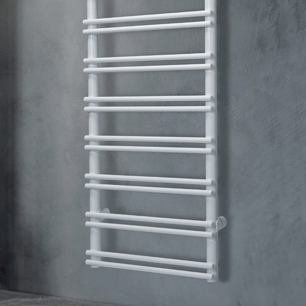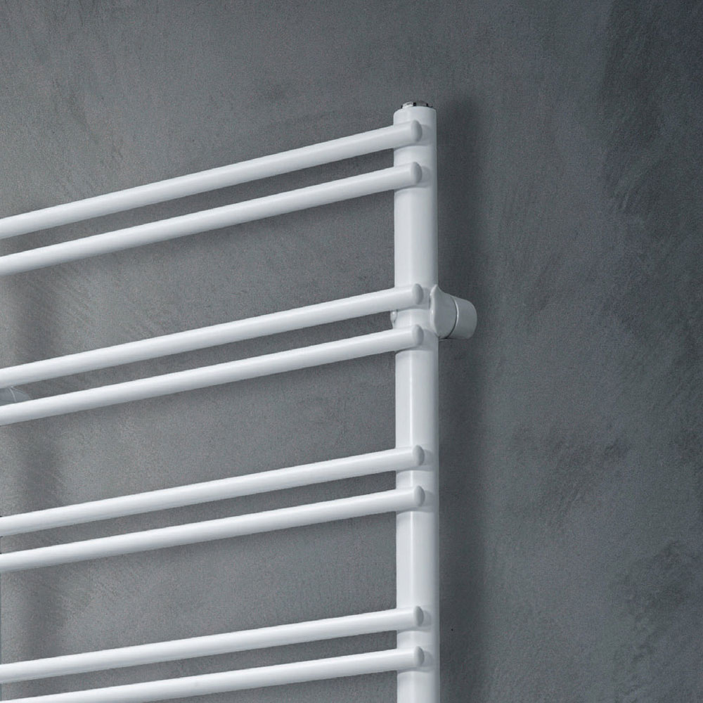 Elektrischer Handtuchwärmer aus Kohlenstoffstahl mit verkehrsweißer Oberfläche mit horizontalen Elementen und vertikalen Kollektoren, vollständig in Italien hergestellt, inklusive Wandbefestigungsset . Elektrifizierungssatz unten rechts positioniert.