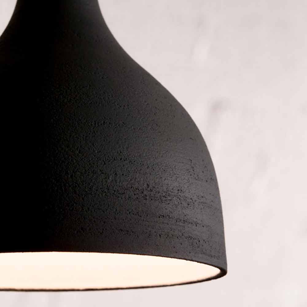 Die Lampe ist aus mattem Anthrazit Steinzeug, eine Zusammensetzungskontinuitäts Material , das unterscheidet sich von Keramik für eine größere Beständigkeit gegen Witterungseinflüsse, Brand- und Wärmeschocks. Weiß emailliertes Interieur.