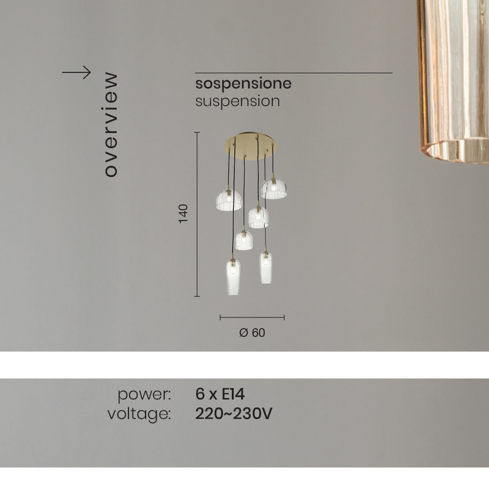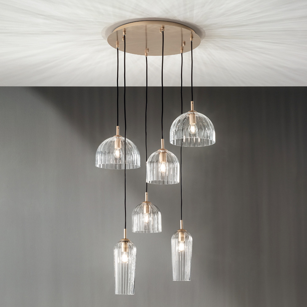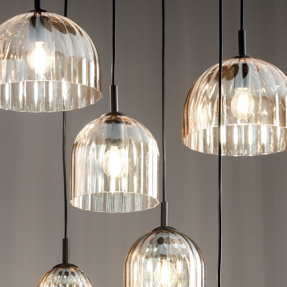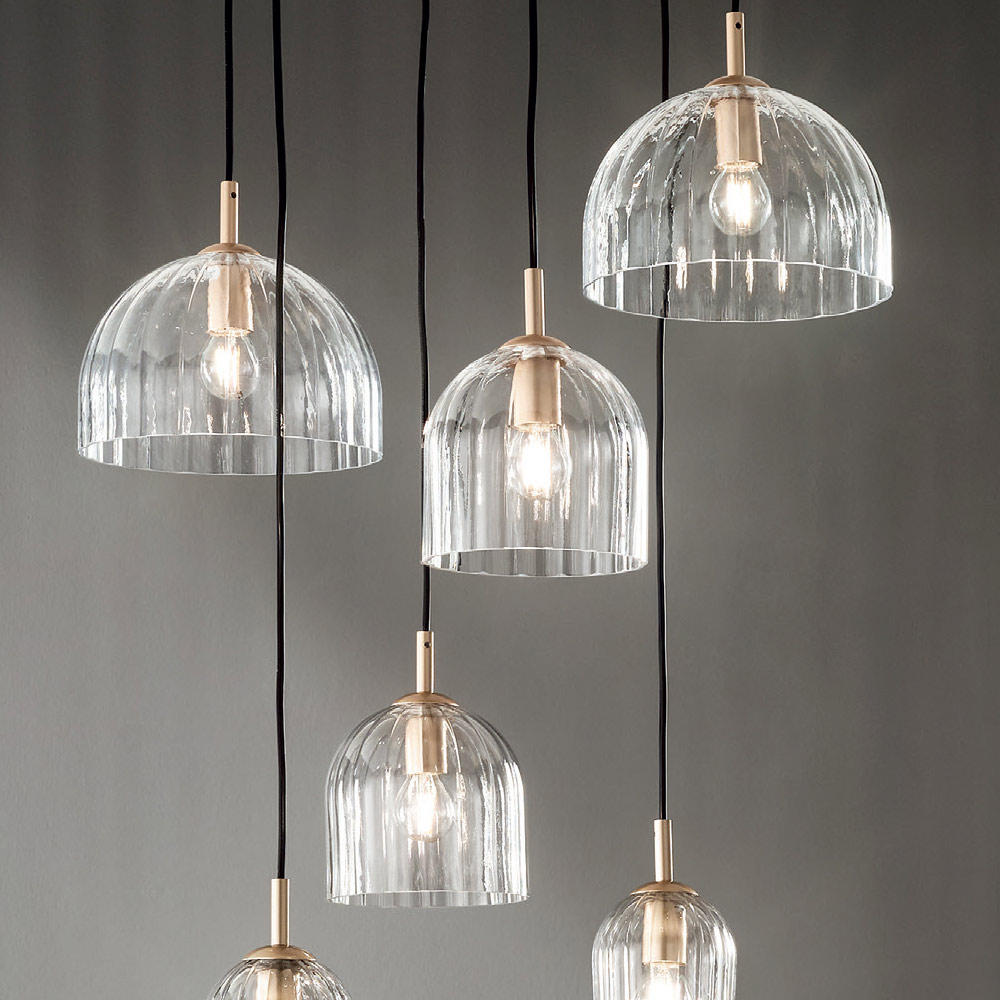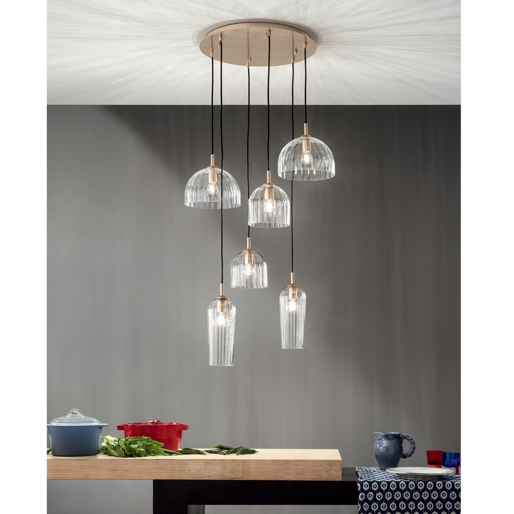 Pendelleuchte mit lackierter Metallstruktur und gestreiften Lampenschirmen aus mundgeblasenem Glas, komplett mit längenverstellbaren Kabeln. Ein dekoratives Element mit einer raffinierten Ästhetik und einer modernen Seele, das entworfen wurde, um jede Küche, jedes Esszimmer oder jedes Wohnzimmer auf exklusive Weise und mit Charakter zu beleuchten, das sich durch ein zeitgenössisches und avantgardistisches Design auszeichnet. Die wunderbaren Lampenschirme aus mundgeblasenem Glas in verschiedenen Formen und Größen verleihen der Leuchte Persönlichkeit und unterstreichen ihre Eleganz. Die vorgeschlagenen Oberflächen hingegen vervollständigen die endgültige Ästhetik des Produkts, markieren seine Einzigartigkeit und erzeugen einen starken szenografischen Effekt .