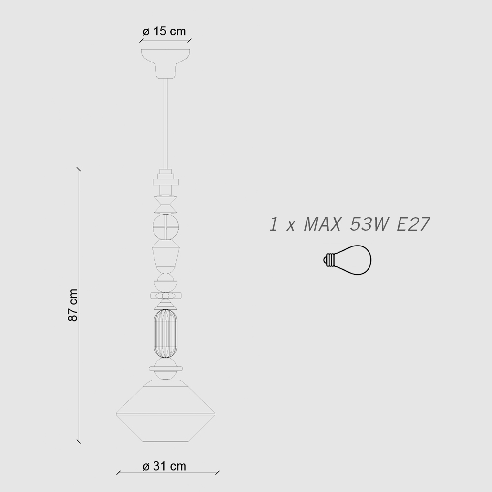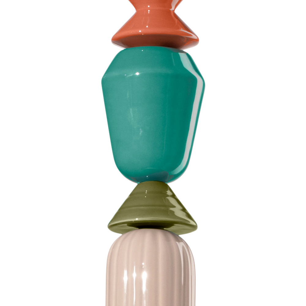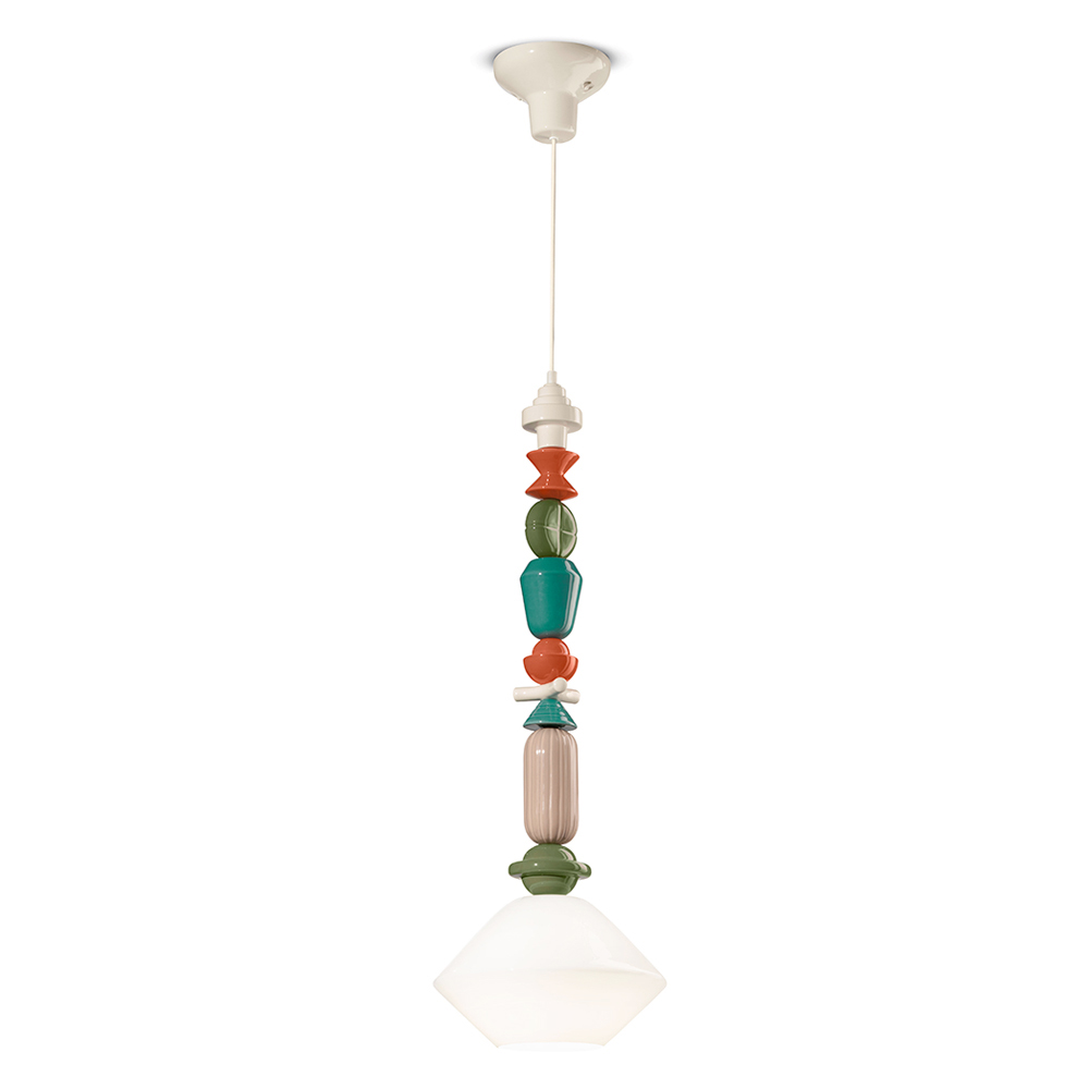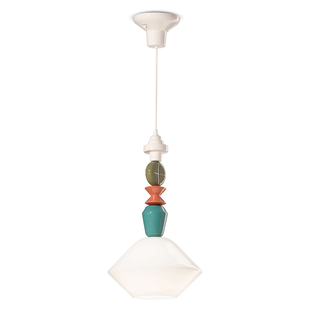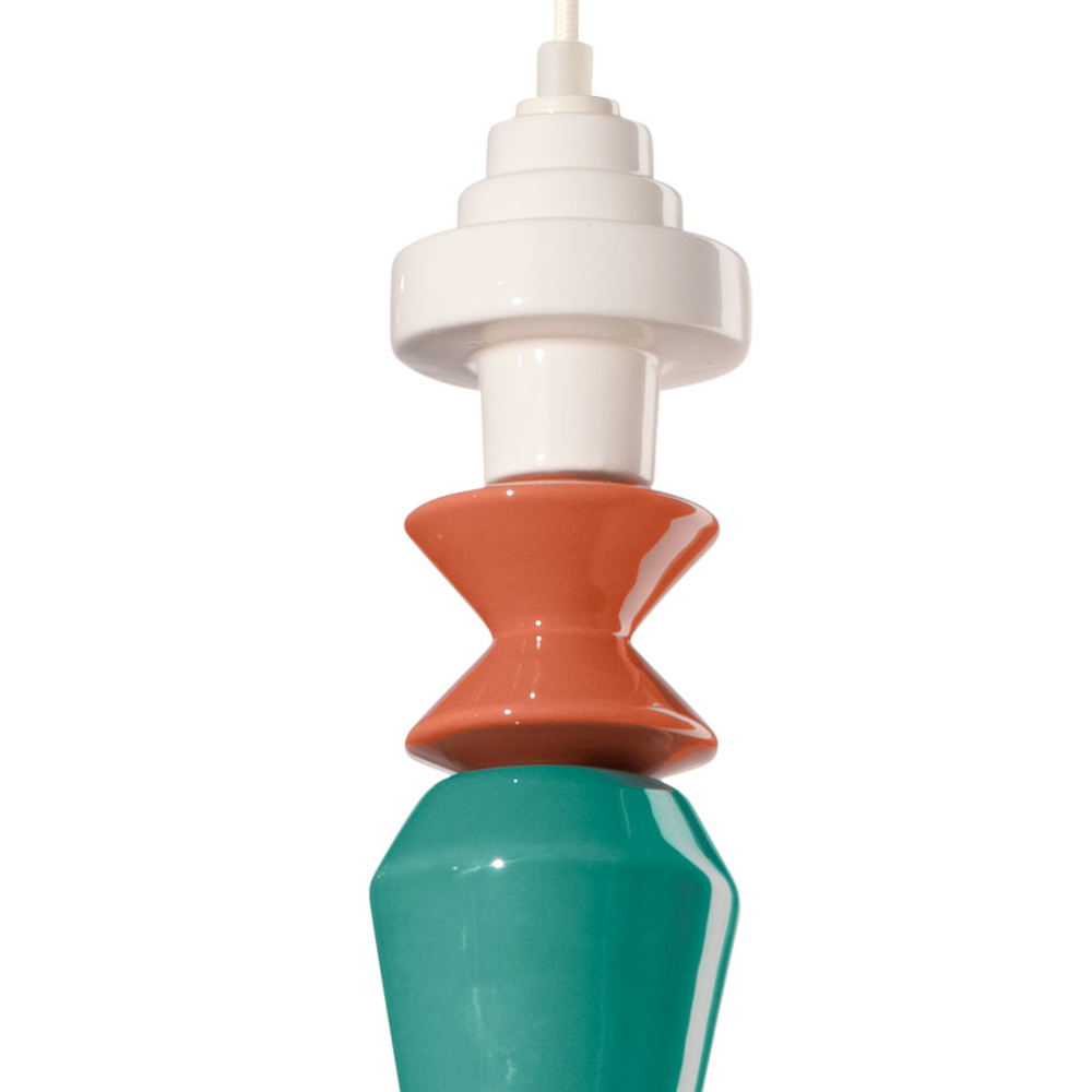 Diese Pendelleuchte ist ein leuchtendes Kunstwerk , das die Wärme von Keramik mit der Transparenz von Glas verbindet. Mit seinen geometrischen Formen und der Abfolge farbiger Elemente sind diese Möbel wie ein Totem aus Licht und Farbe, das jedem Raum Persönlichkeit und Lebendigkeit verleiht.