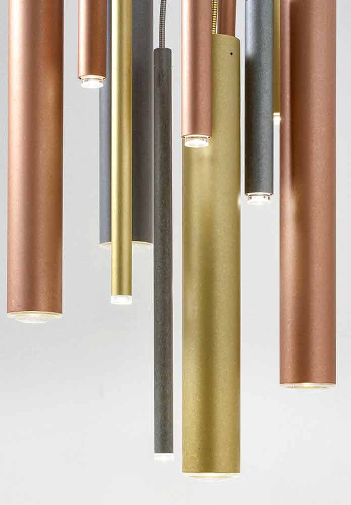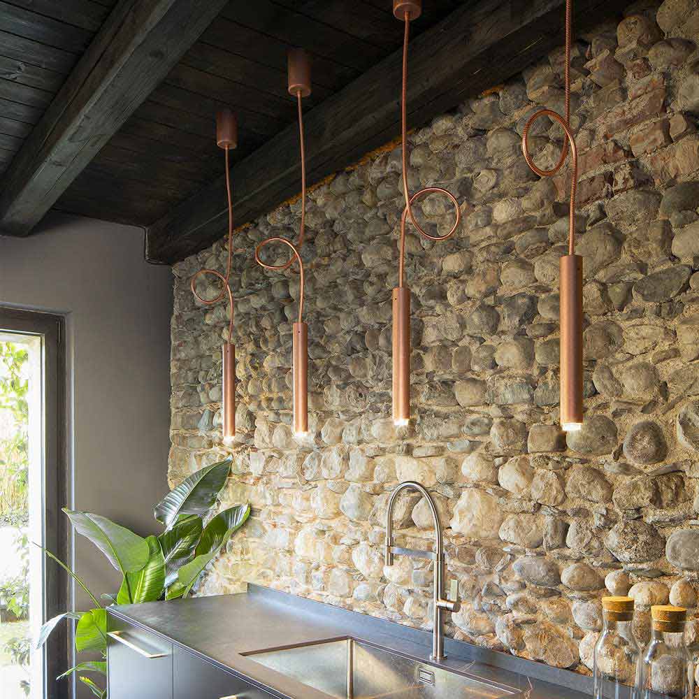 Tubò ist eine raffinierte röhrenförmige Pendelleuchte mit flexiblem Kabel, erhältlich in verschiedenen Materialien und Ausführungen: