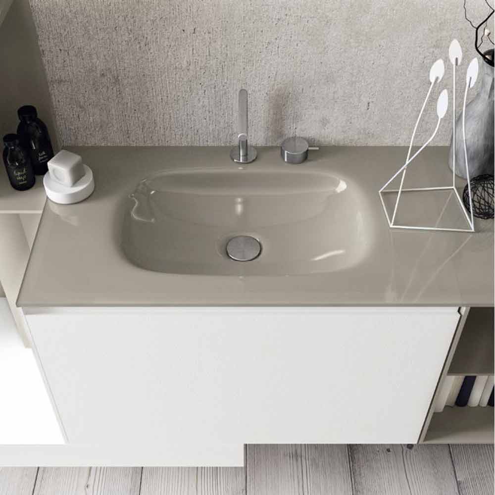 Badezimmermöbel aus steinweißem HPL , integriertes Waschbecken aus glänzendem hellgrauem Glas , Spiegel mit LED-Beleuchtung, offene Elemente aus mattem hellgrauem Lack.