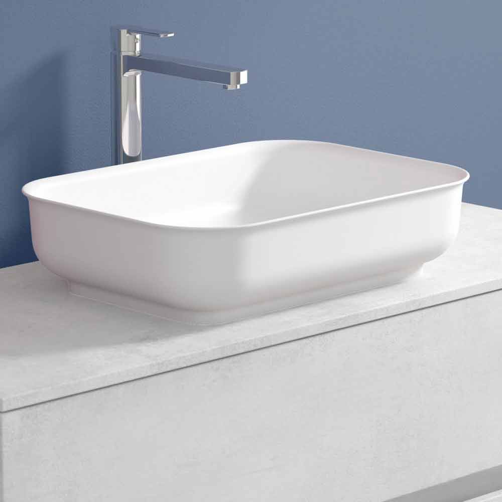 Das rechteckige Arbeitsplattenwaschbecken besteht aus Solid Matt, einem opaken weißen Mineralharz , und ist mit einem opaken Gelcoat versehen , der das Produkt wasserdicht macht.