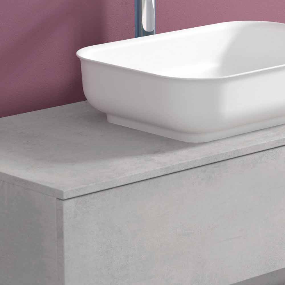 Der Waschtischboden mit einer Standardschublade und einer geformten Schublade besteht aus laminierter und wasserabweisender Hydro W 100-Holzfaser , um eine längere Lebensdauer zu gewährleisten und zu verhindern, dass der Schrank bei Kontakt mit Wasser beschädigt wird.