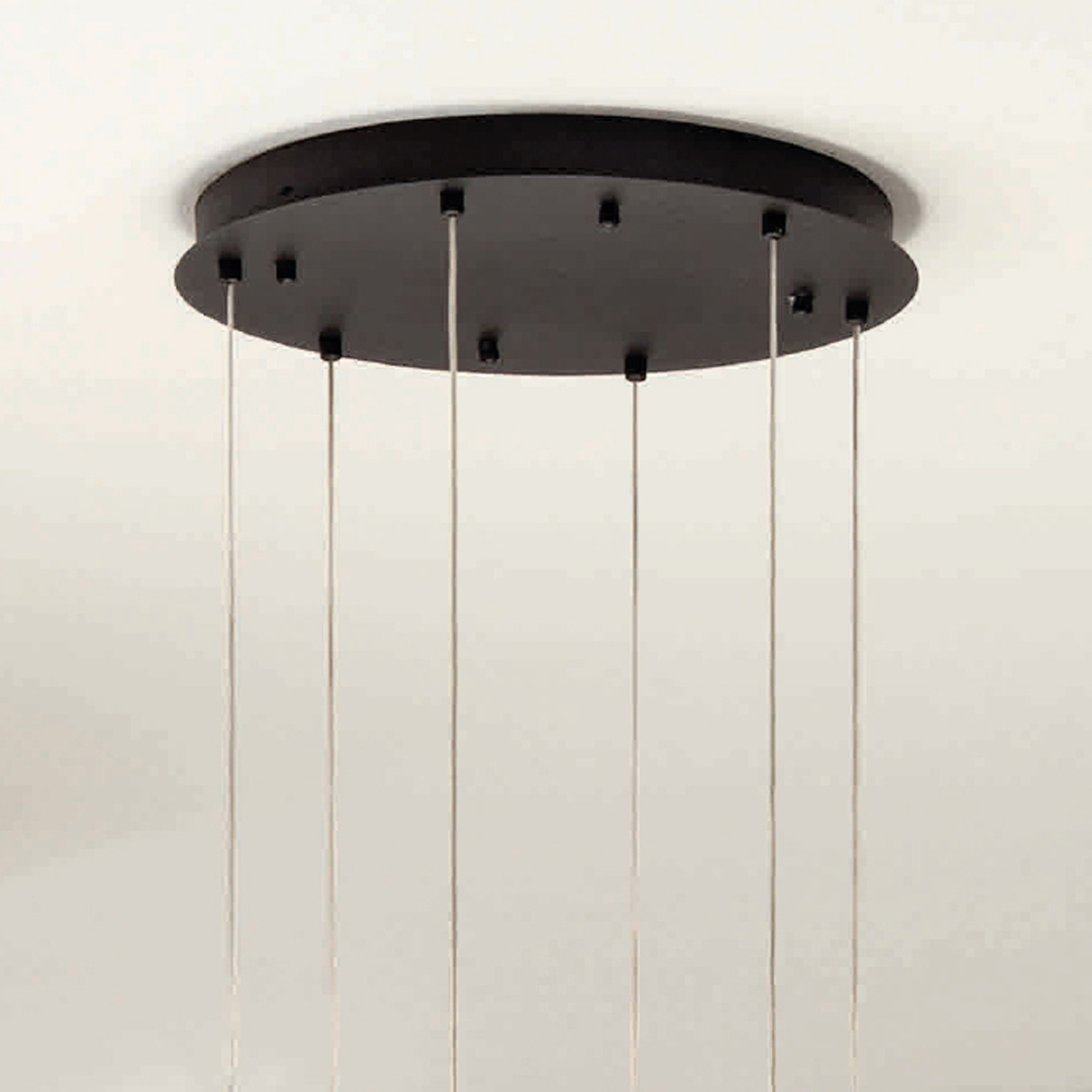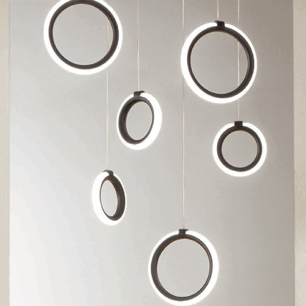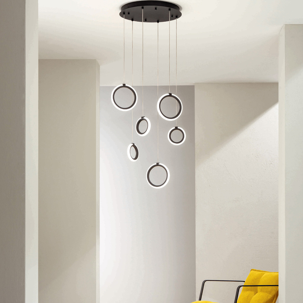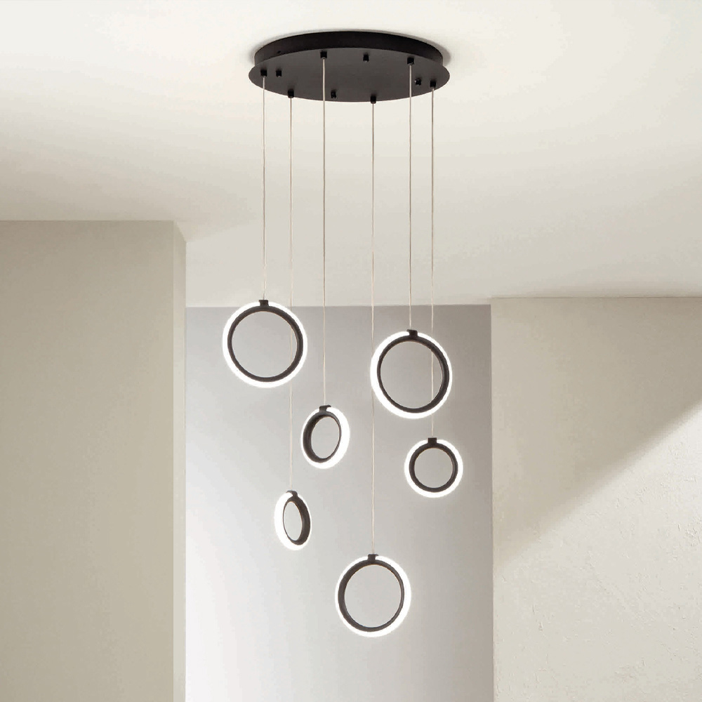 Komplett in Italien hergestellterKronleuchter aus schwarz lackiertem Metall mit längenverstellbaren Kabeln und 6 dimmbaren kreisförmigen LED-Leuchten . Ziel dieses Produkts ist es, die Tradition durch einen zeitgenössischen Ansatz aufzuwerten, bei dem Stil, Klasse und Innovation zu neuen Designformeln verschmelzen, um jede Umgebung mit Geschmack und Charakter einzurichten und zu beleuchten. Stärken sind die Besonderheit der Formen , die Qualität der Materialien und die Einzigartigkeit der Lichtquelle .