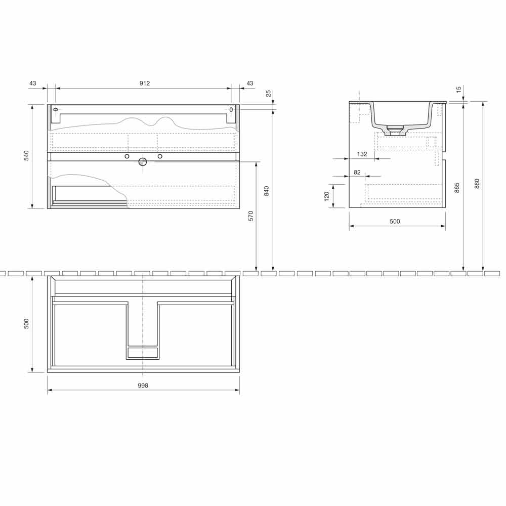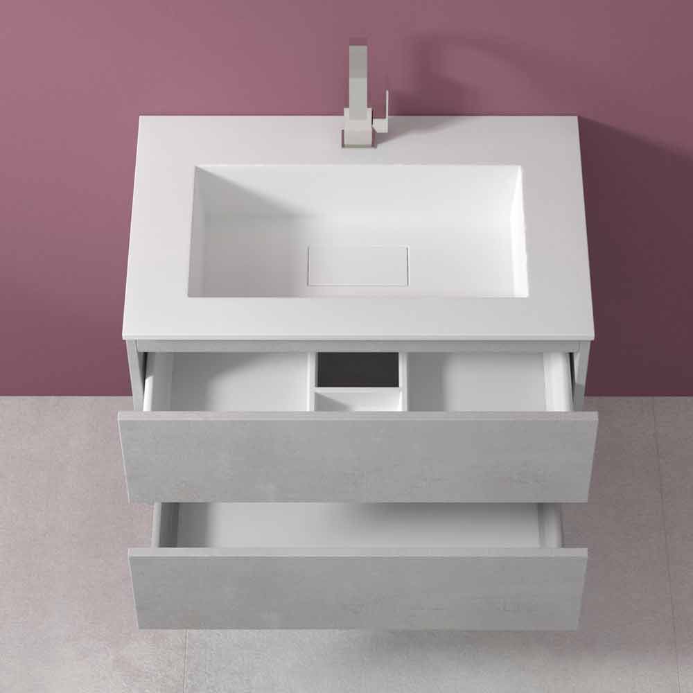 Der Waschtischboden mit einer Standardschublade und einer geformten Schublade besteht aus laminierter und wasserabweisender Hydro W 100-Holzfaser , um eine längere Lebensdauer zu gewährleisten und zu verhindern, dass der Schrank bei Kontakt mit Wasser beschädigt wird.