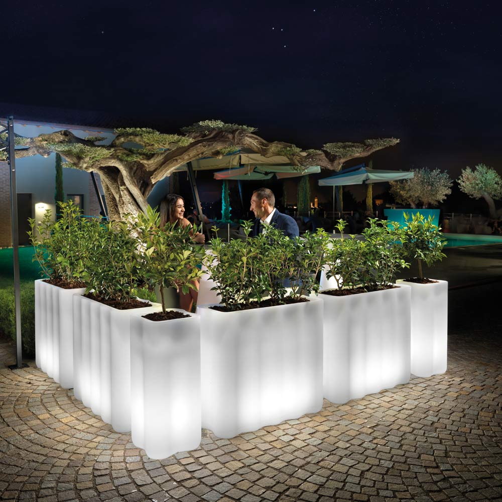 Die leuchtende Außenvase aus Perlpolyethylen , hergestellt in Italien . Das integrierte LED-Licht verwandelt diese Außenvase in ein Einrichtungsaccessoire mit weichen und geschwungenen Linien, das eine Idee von klassischem, aber unglaublich elegantem Stil widerspiegelt. Die Struktur enthält auch ein Wasserablaufset, um die maximale Funktionalität und Funktionalität dieses Produkts auszunutzen, ohne das Endergebnis, eine elegante und eindrucksvolle Lichtatmosphäre, zu vernachlässigen.