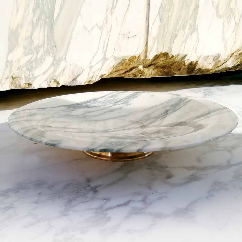 Herzstück, das sich durch ein raffiniertes Design und seine Form mit geschwungenen und harmonischen Linien auszeichnet, die dem Produkt ein leichtes und modernes Aussehen verleihen. Dieses von Hand in Italien hergestellte Produkt besteht aus einer goldfarbenen Metallbasis und einer runden Platte aus Brezza della Versilia- Marmor, einem kompakten Marmor mit warmweißer Basis und Aquamarinadern, die an die Meeresbrise erinnern und einen originellen und raffinierten Effekt erzeugen . . Das Finish ist glänzend und wird dank eines handwerklichen Verfahrens erhalten, das dem Produkt weitere Qualität und Verfeinerung verleiht. Die Kombination von Materialien, Oberflächen und Techniken zusammen mit der wunderbaren Arbeit der Meister ermöglicht es, ein qualitativ hochwertiges Endprodukt mit Liebe zum Detail zu erhalten, das sich perfekt für die Dekoration von Umgebungen mit einem zeitgemäßen und raffinierten Geschmack eignet.