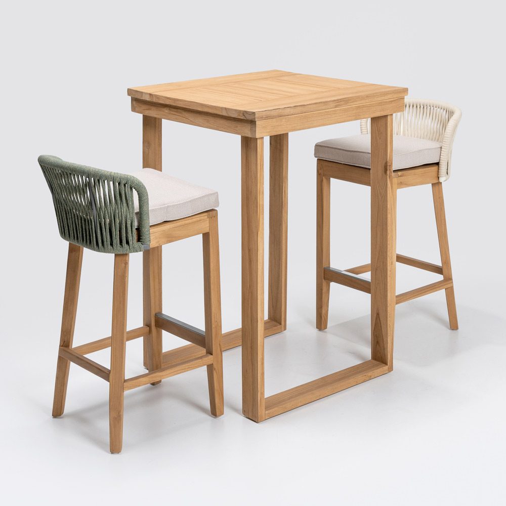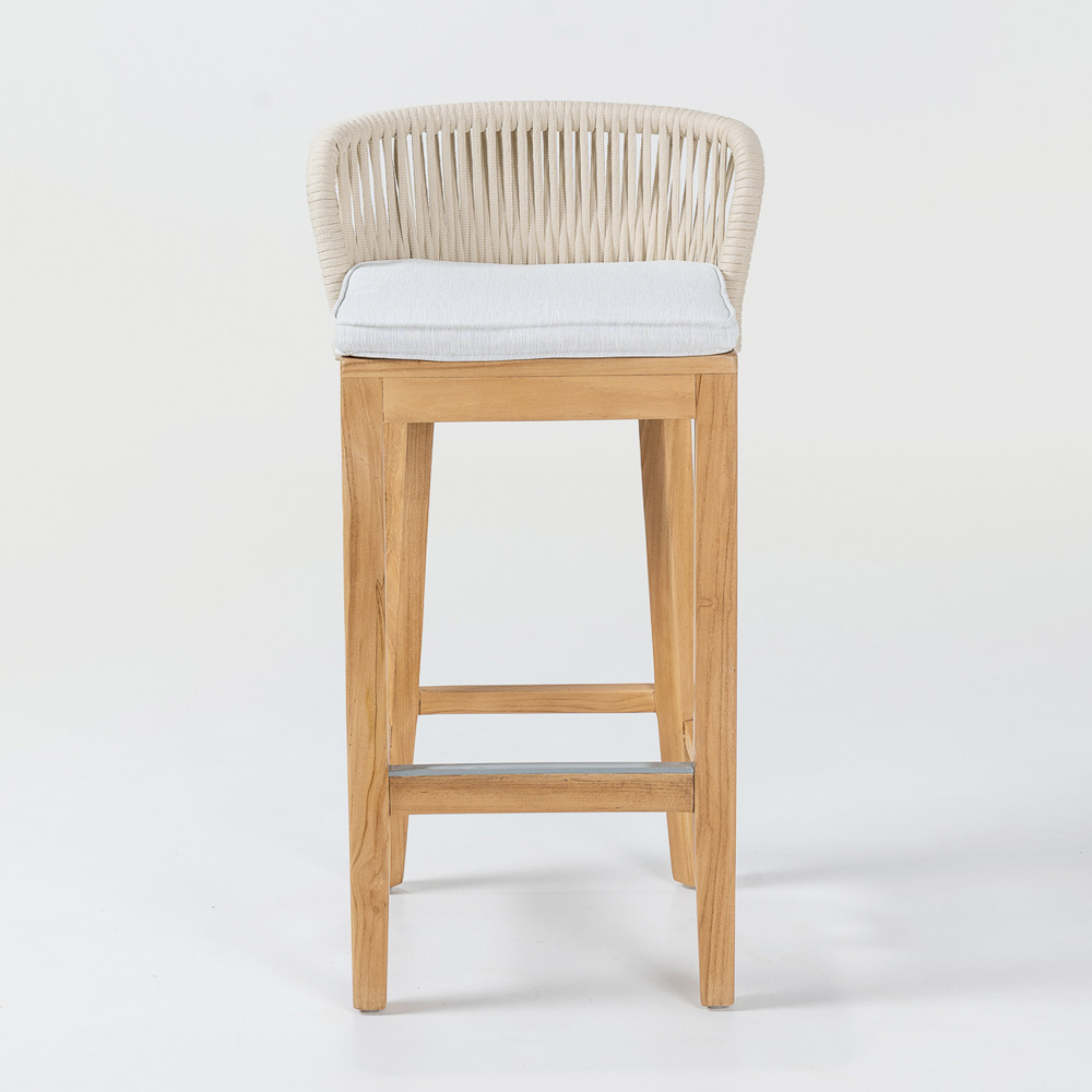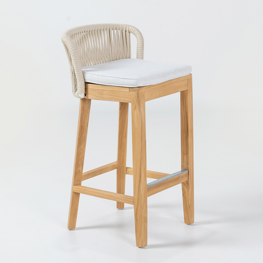 Dieser elegante und vielseitige Barhocker besticht durch sein Gestell aus natürlichem Teakholz und Aluminium und vereint so Stabilität und Leichtigkeit . Das Kissen aus havannagrauem Stoff bietet hervorragenden Sitzkomfort, während das Olefin/PP-Seilgeflecht nicht nur für einen Hauch von Eleganz sorgt, sondern auch witterungsbeständig ist – ideal für den Innen- und Außenbereich.