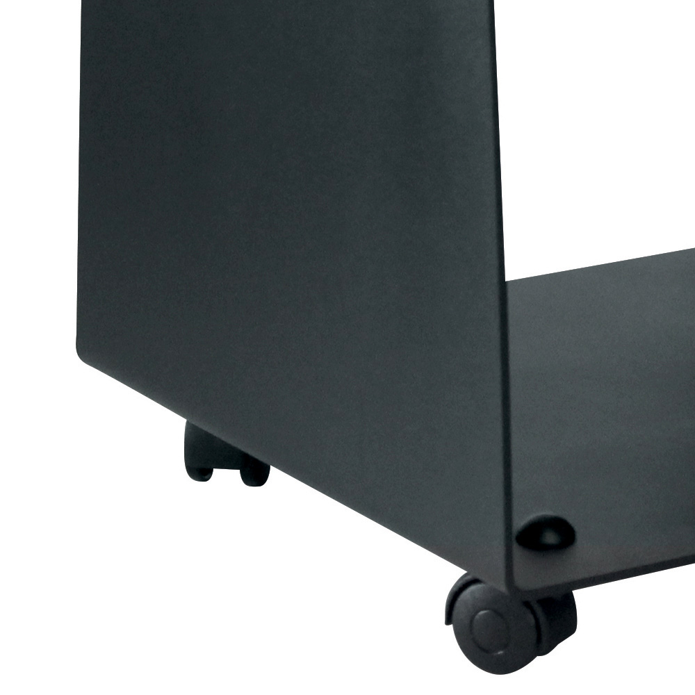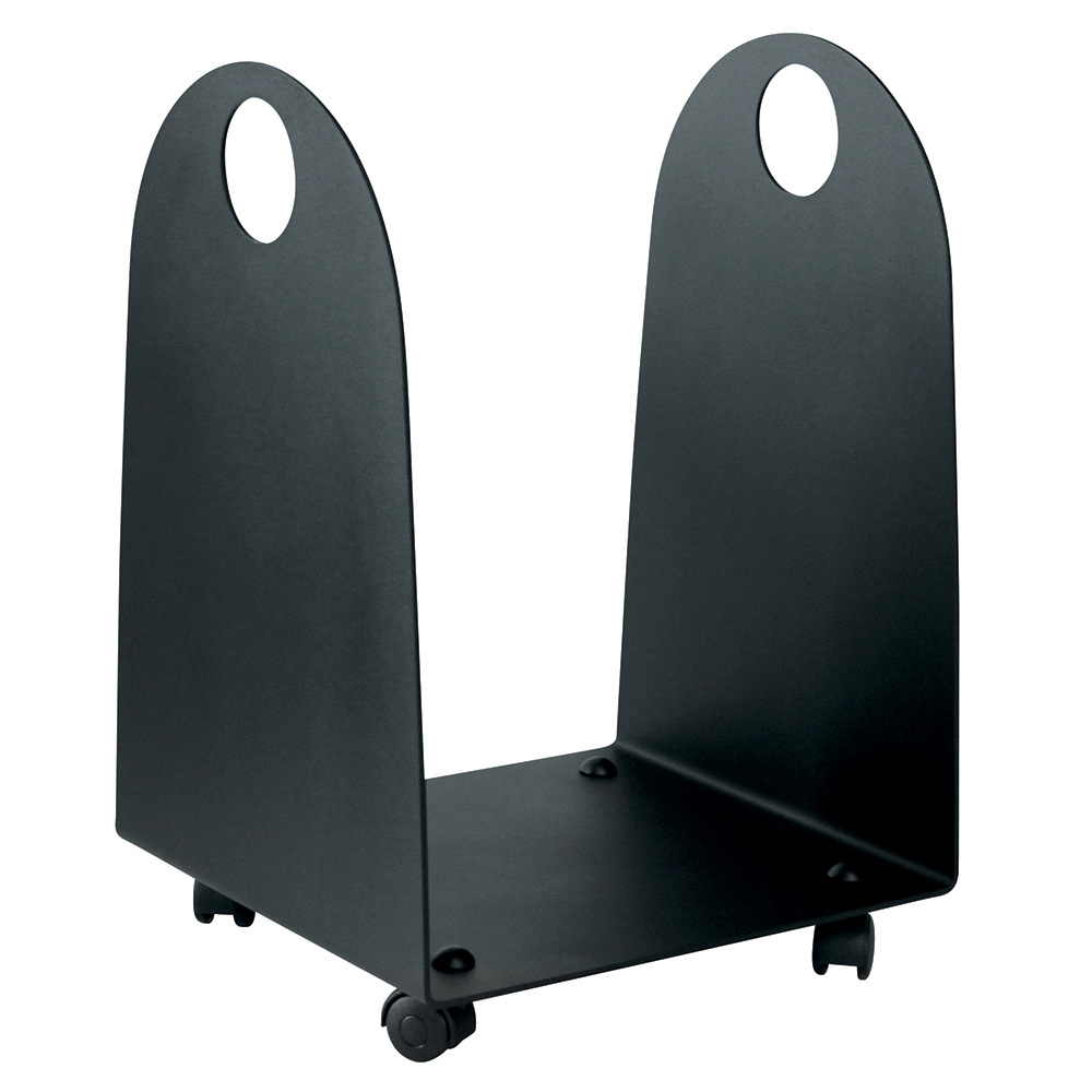 Die schwarze Oberfläche und das minimalistische Erscheinungsbild machen es zu einem eleganten und vielseitigen Stück, das für jede Art von Einrichtung geeignet ist, von rustikal bis modern. Ausgestattet mit Rädern ist dieser Holzhalter äußerst praktisch, sodass Sie Holz mühelos und mühelos von einem Raum in einen anderen transportieren können. Durch das offene Design können Sie Holz geordnet aufbewahren und leicht darauf zugreifen, während die integrierten Griffe den Transport und die Handhabung erleichtern.