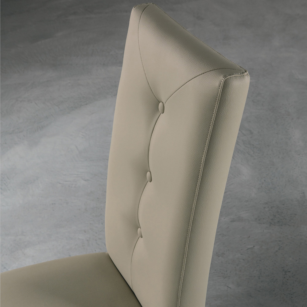 Dieser Wohnzimmerstuhl wird in Italien mit lackierter Buchenholzstruktur hergestelltund in verschiedenen Ausführungen erhältlich, die den Kunstledersitz mit Knöpfen auf der Rückseite unterstützen. Sein modernes und elegantes Design zeichnet sich durch reine und einfache Linien aus, die maximalen Komfort gewährleisten und gleichzeitig einen hohen ästhetischen Geschmack garantieren.