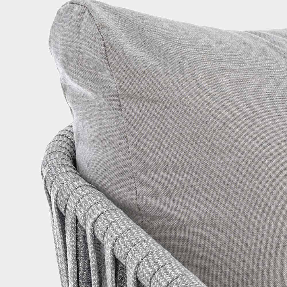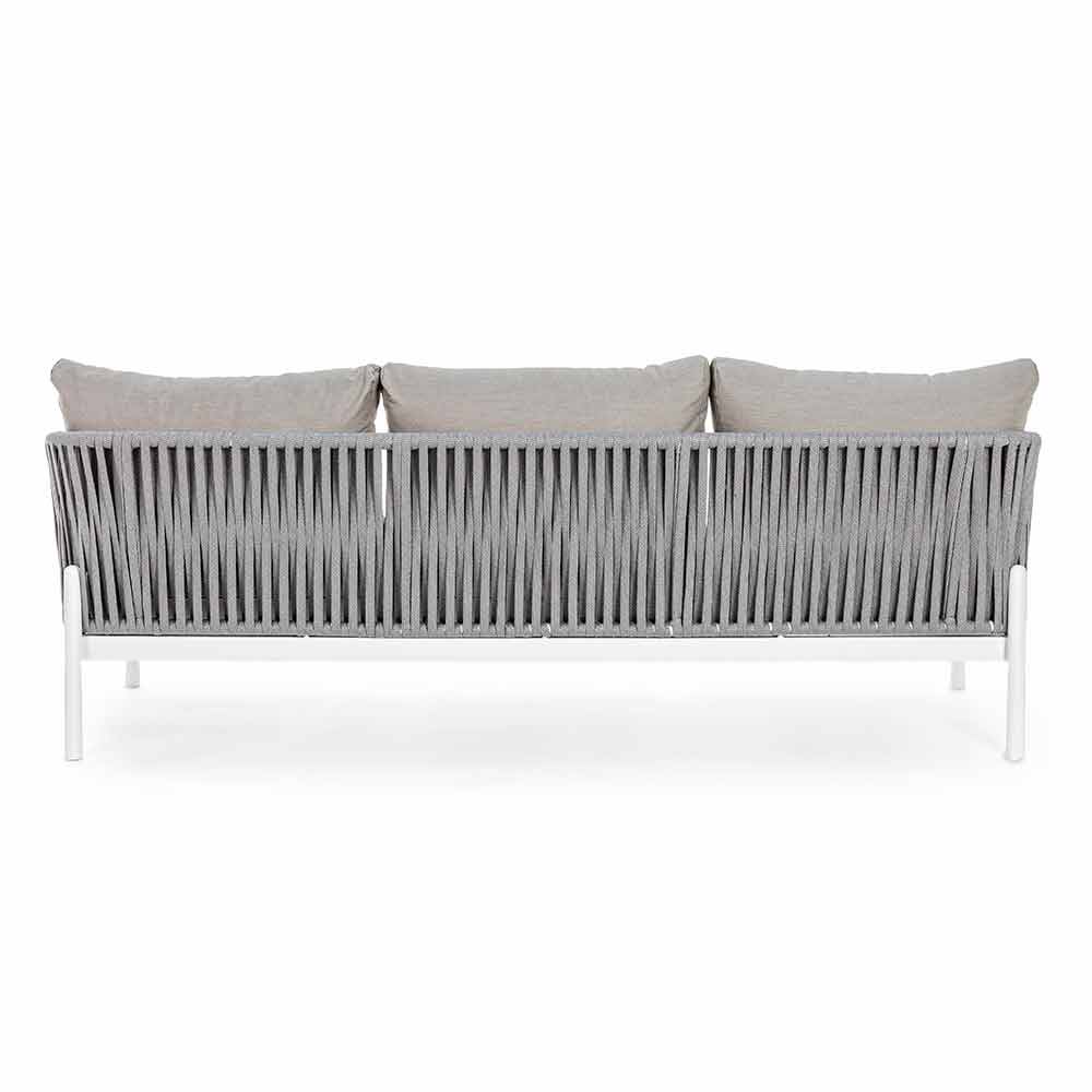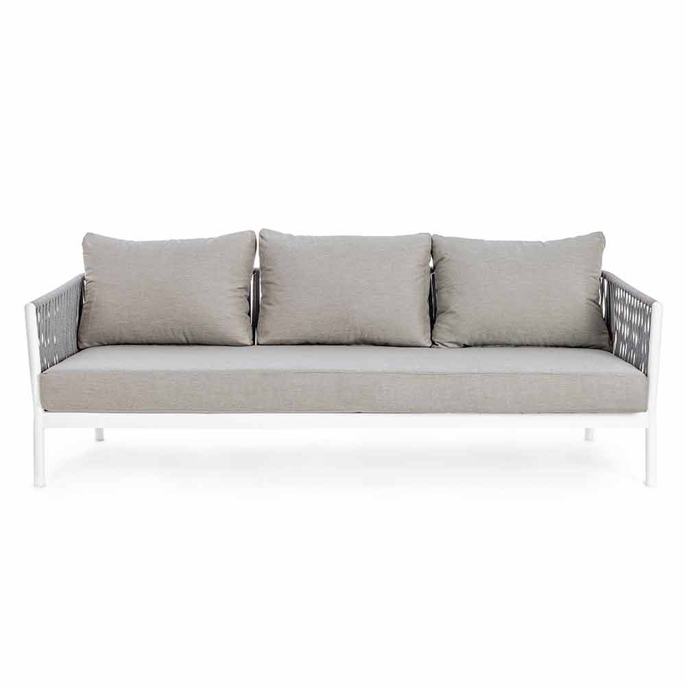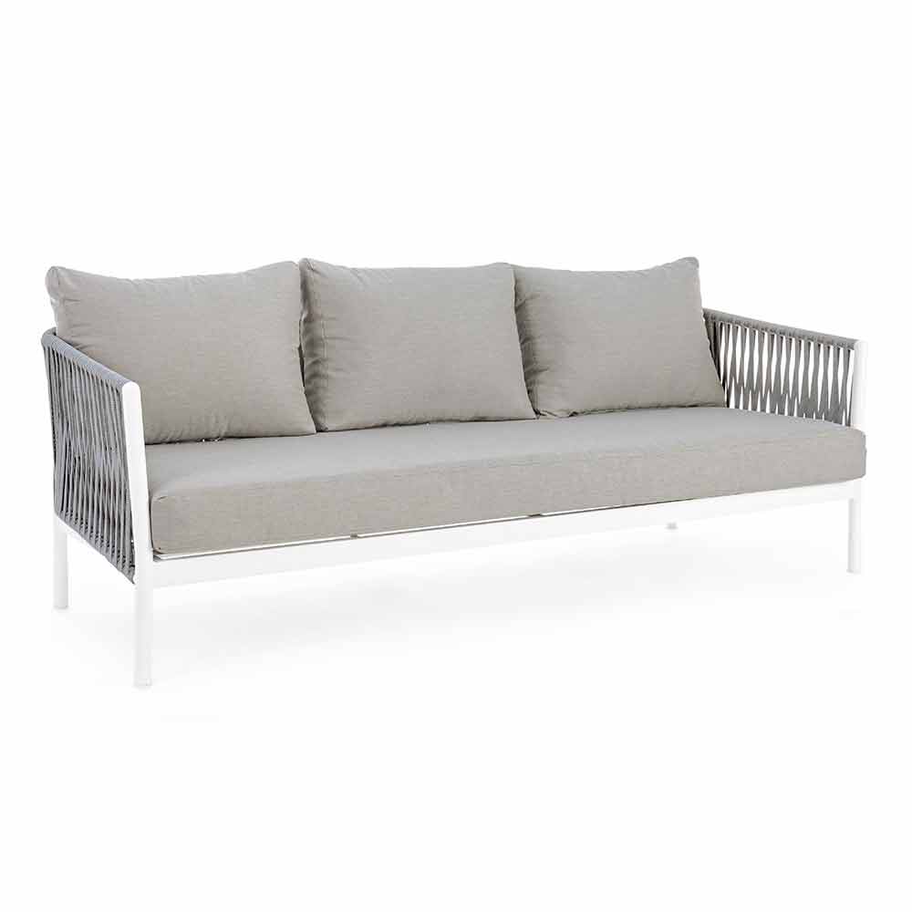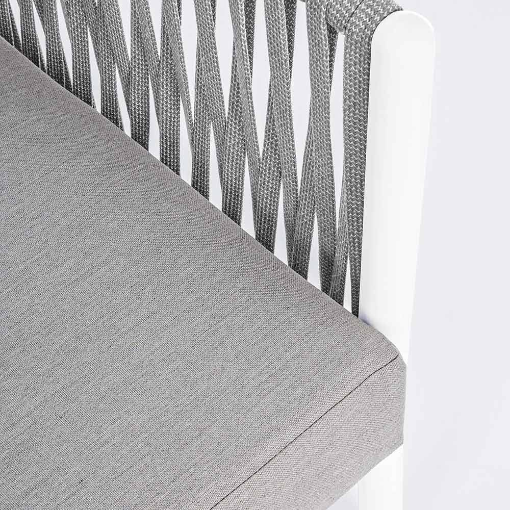 Outdoor-Sofa im modernen Design aus weißem Aluminium mit Seilbindung und grauen Kissen.
