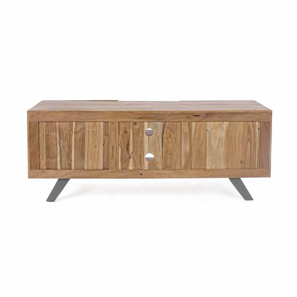 TV-Schrank mit Mango-Holz-Struktur und Metalleinsätzen.