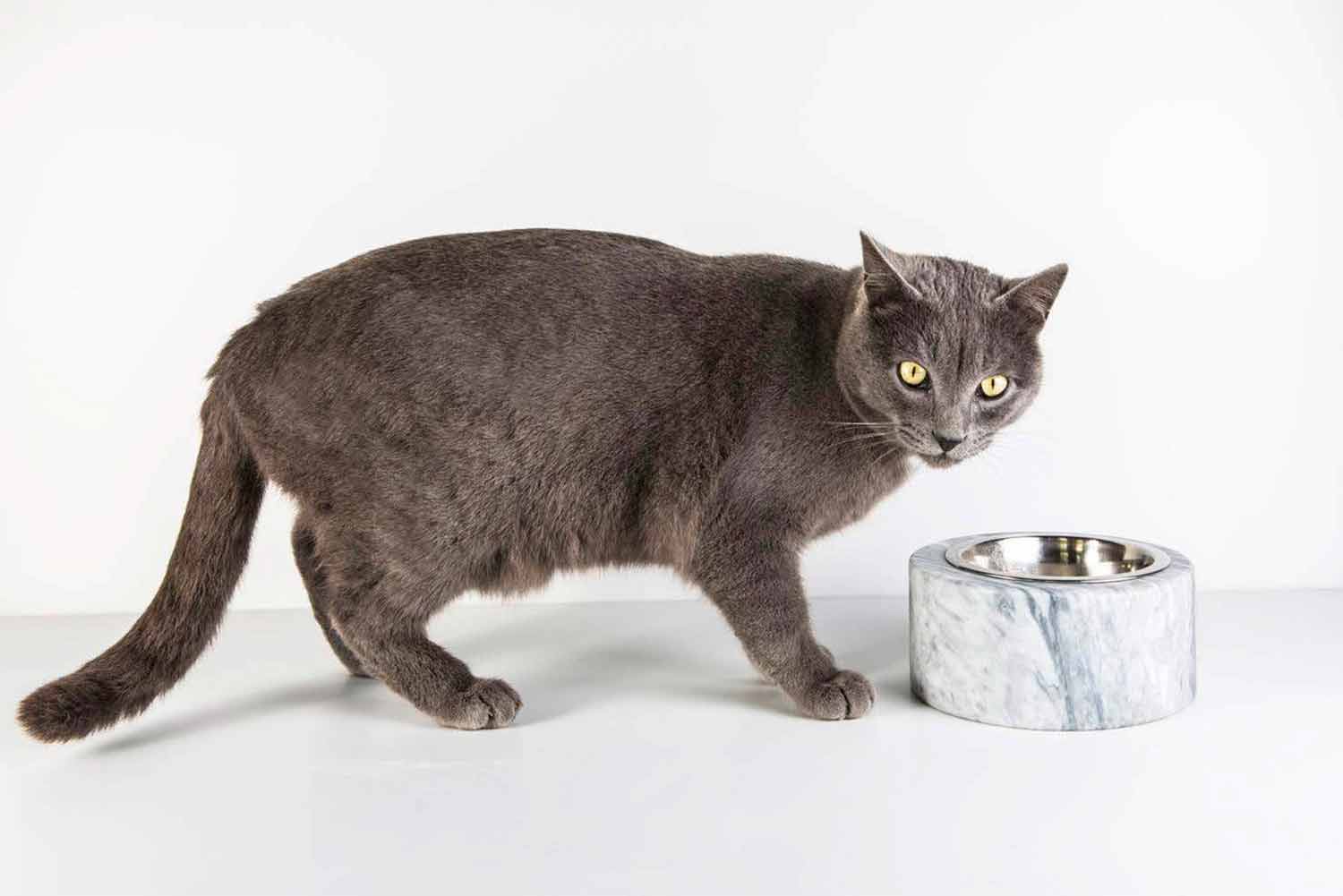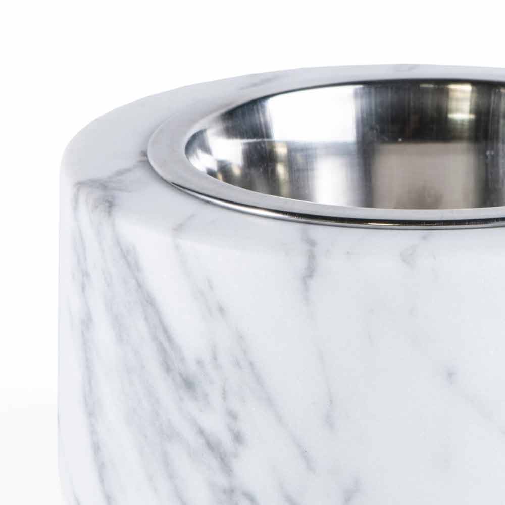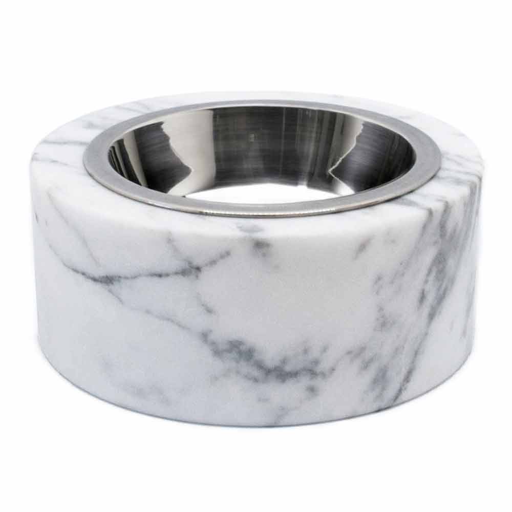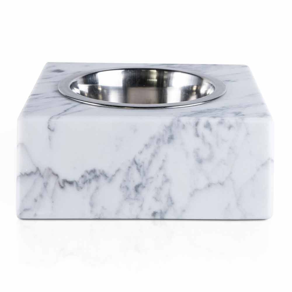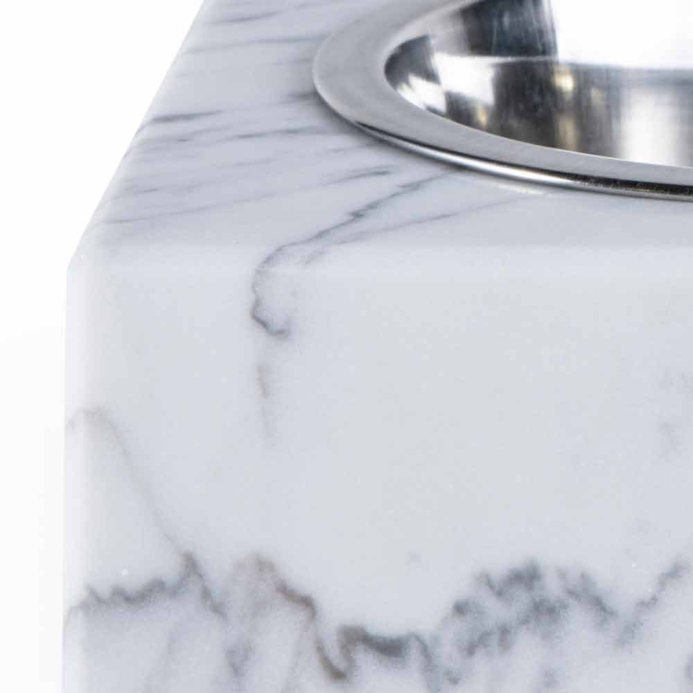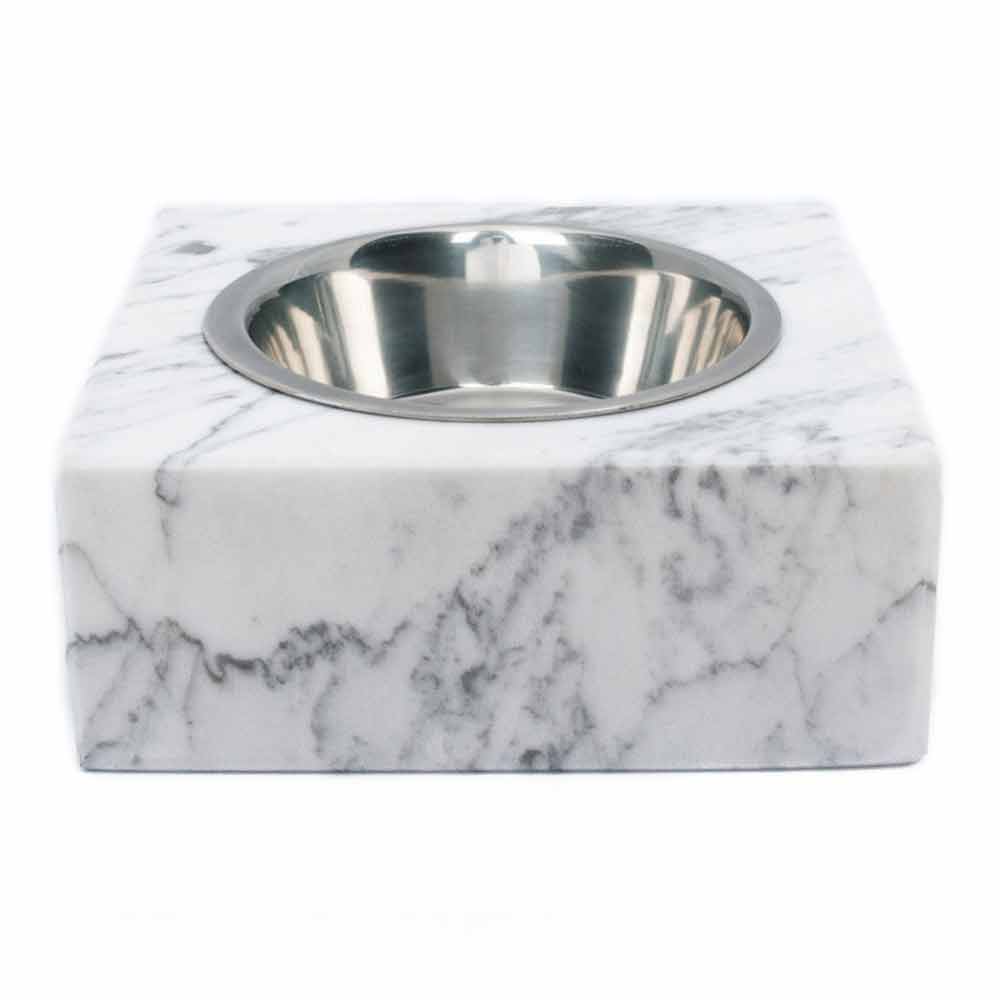 Schüssel für Hunde und Katzen, gekennzeichnet durch den weißen Carrara-Marmor, aus dem er besteht. Es ist ein Unikat , da sich jeder verwendete Marmorblock von den anderen für Adern und Schattierungen unterscheidet.