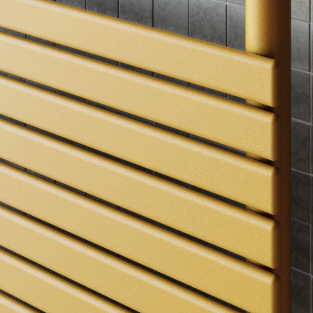 Entdecken Sie das minimalistische Design und die fortschrittliche Funktionalität dieses ockergelben Handtuchwärmers, der sich harmonisch in ein modernes und elegantes Badezimmerambiente einfügt. Die schlanke Struktur und die klaren Linien sorgen für einen zeitgenössischen Look, der perfekt zu raffinierten Innenräumen und natürlichen Materialien passt.