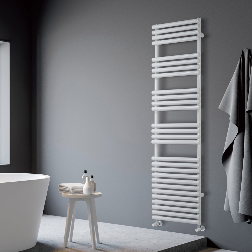 Hydraulischer Handtuchwärmer aus Kohlenstoffstahl mit reinweißer Hochglanzoberfläche, bestehend aus einer Reihe horizontaler Elemente mit einem Durchmesser von 3,5 cm, die auf vertikale Verteiler mit einem Durchmesser von 3,5 cm geschweißt sind, vollständig in Italien hergestellt,inklusive Wandbefestigungsset, Entlüftungsventil und Blindkappe . Dieses Element wird im Werk in Treviso, nur wenige Kilometer von Venedig entfernt, gefertigt und garantiert somit die gewohnte Qualität und Effizienz von „Made in Italy“. Wissen und das Streben nach Innovation in Prozessen und Produkten bilden die Grundlage und die Werte für die Entwicklung eines Produkts , das Spitzentechnologie und -design , ästhetische Schönheit und Funktionalität vereint.