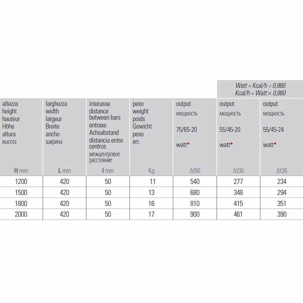 • H 1200 x L 420 x Inter. 50 mm x Ausgang w (Δt50 *) 540; Ausbeute w (Δt30 *) 277; Ausbeute w (Δ26 *) 234;