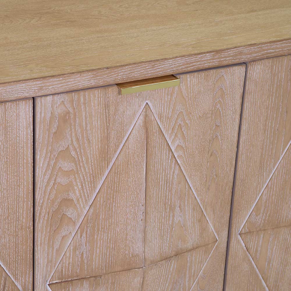 Die Tannenholzbeine verleihen dem Schrank eine solide Struktur, die durch ein klares und modernes Design bereichert wird. Die Türen, die mit einem eingravierten geometrischen Muster verziert sind, fügen einen Hauch von Originalität und Raffinesse hinzu.
