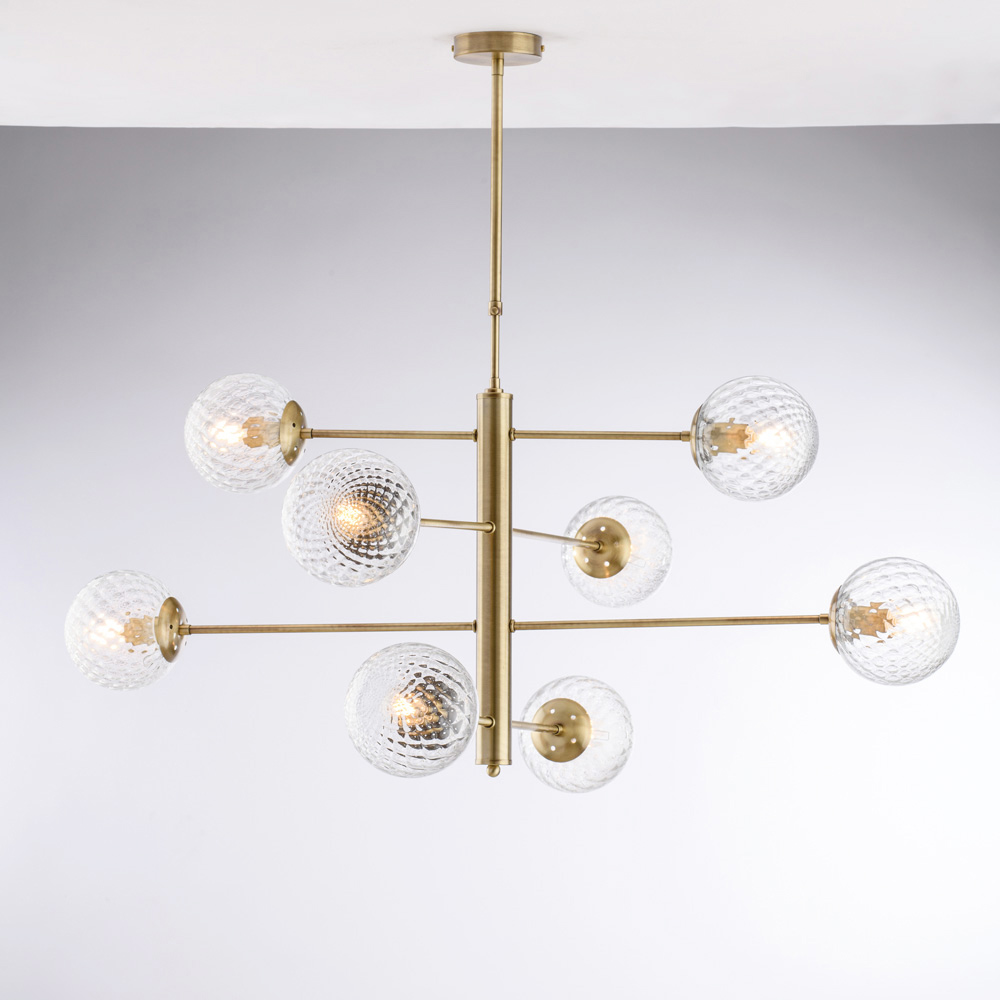 Diese elegante und moderne, handgefertigte Pendelleuchte aus Eisen besticht durch ihre ausgewogene, geometrische Form. Die horizontalen Arme tragen kugelförmige Glasdiffusoren und erzeugen so ein raffiniertes Zusammenspiel von Symmetrien, das ein diffuses, harmonisches Licht verbreitet.