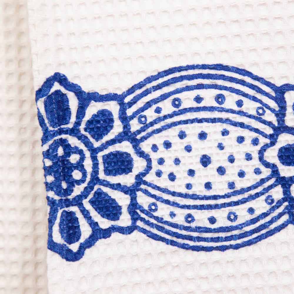 Badetuch in weißer Farbe von hoher italienischer Handwerkskunst aus reiner Wabenbaumwolle, von Hand bedruckt mit antiker blauer Zeichnung eines Zierfrieses aus dem 18. Jahrhundert, Welterbe.