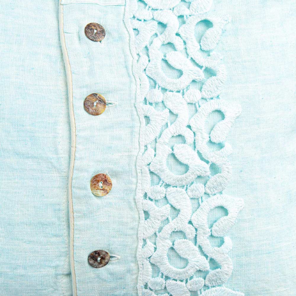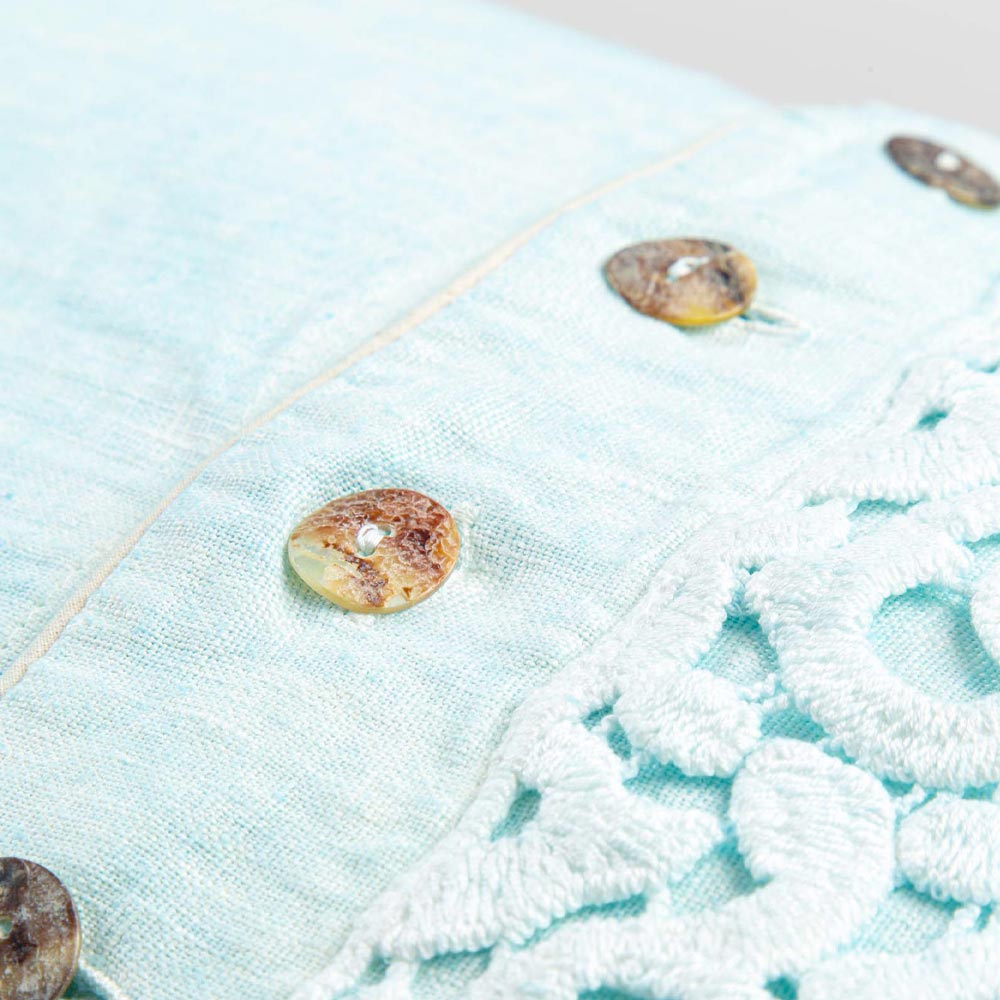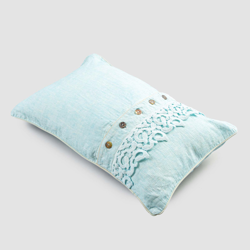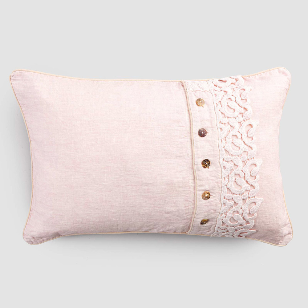 Der Wert der Tradition verbindet den modernen Lebensstil mit diesem Fall Leinen Kissen mit Gedichte Spitze verziert, Agoya Perlmutt-Perlmuttknöpfen und Rohrleitungen.