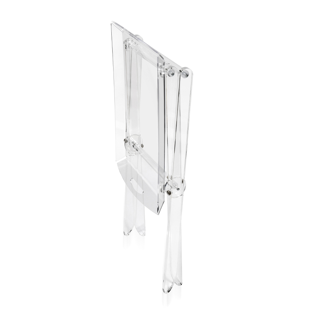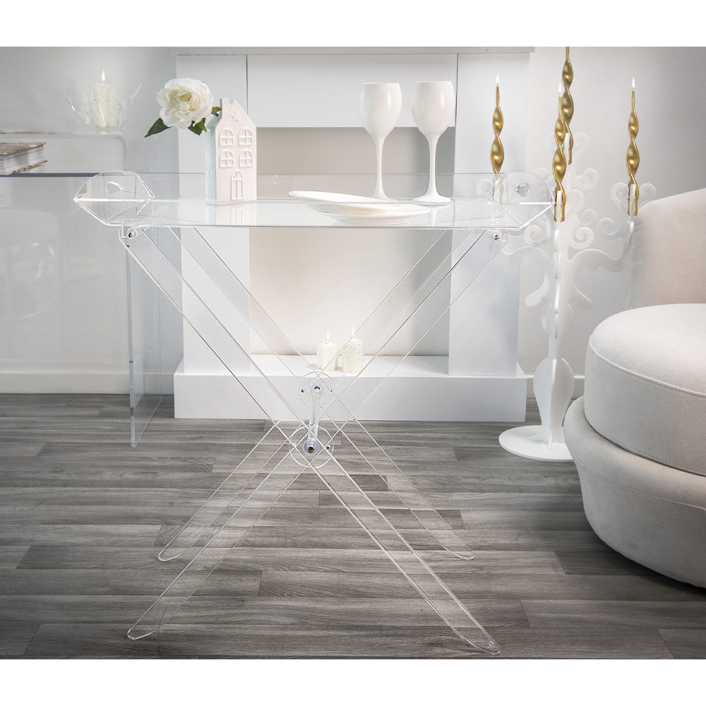 Dieser Klapptisch aus Acrylglas aus jungfräulichem Polymer zeichnet sich durch sein vielseitiges und praktisches Design aus, das zusammengeklappt werden kann, um die Unordnung zu minimieren, mit einem Tablett-Regal , das zum Frühstück oder zum Servieren von Kaffee für Gäste verwendet werden kann. Konzipiert, entworfen und hergestellt in Italien , mit italienischen Materialien, die Helligkeit und Brillanz konstant und im Laufe der Zeit unverändert.