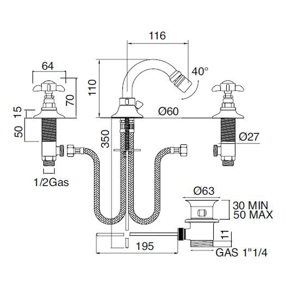 Klassische 3-Loch-Bidetbatterie aus Messing und Schmetterlingsgriffen - Miriano