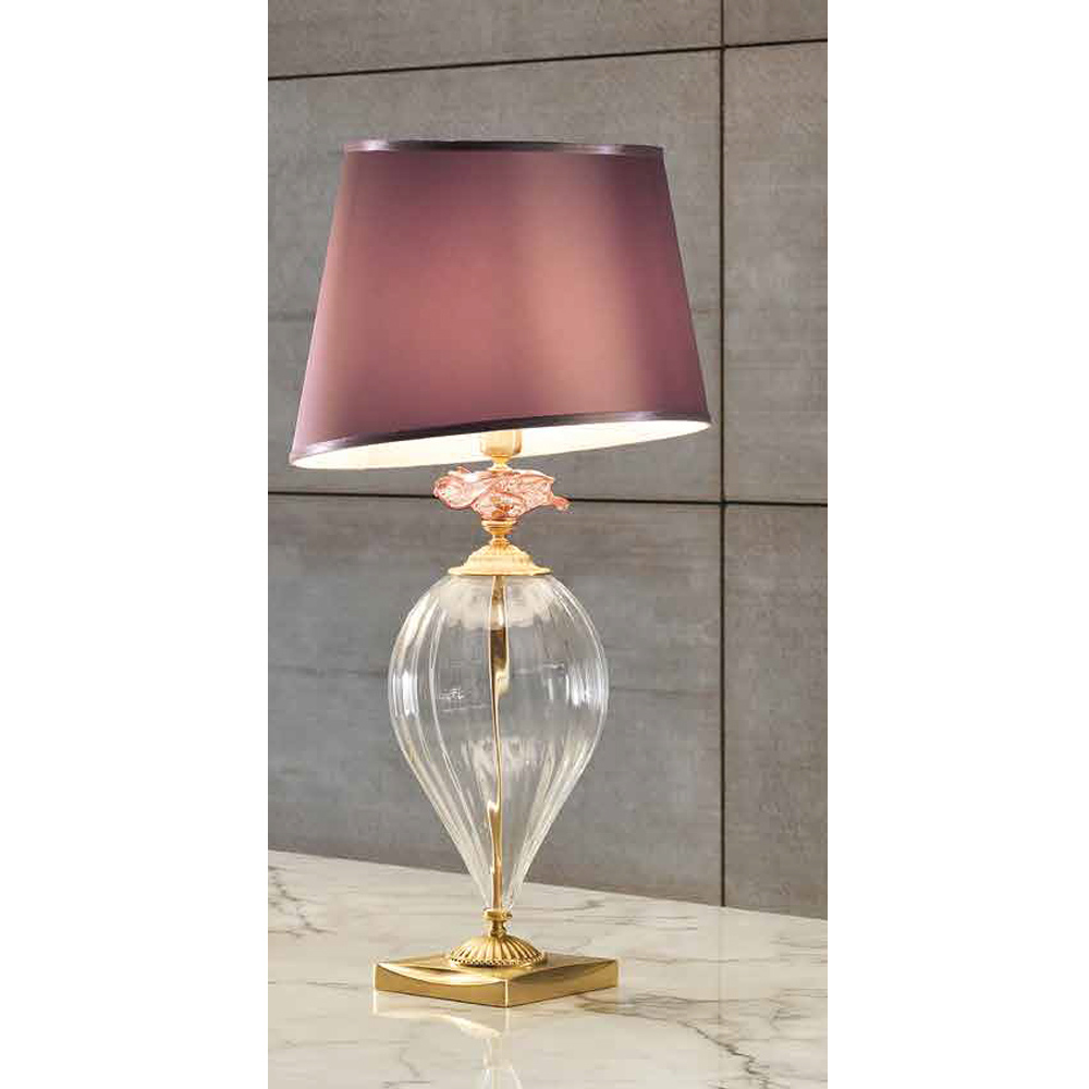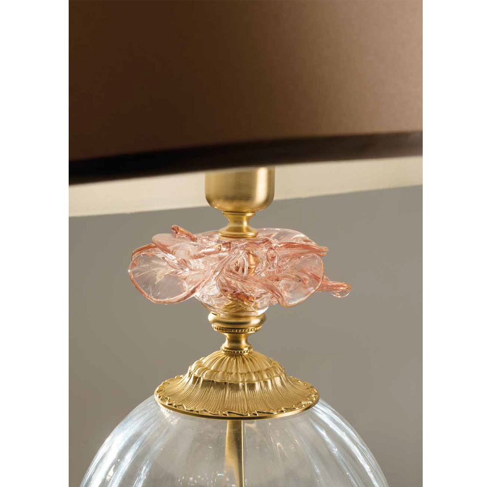 - Körper aus transparentem Glas - Details aus roséfarbenem Glas - satiniertes Goldmetall und roséfarbener Lampenschirm;