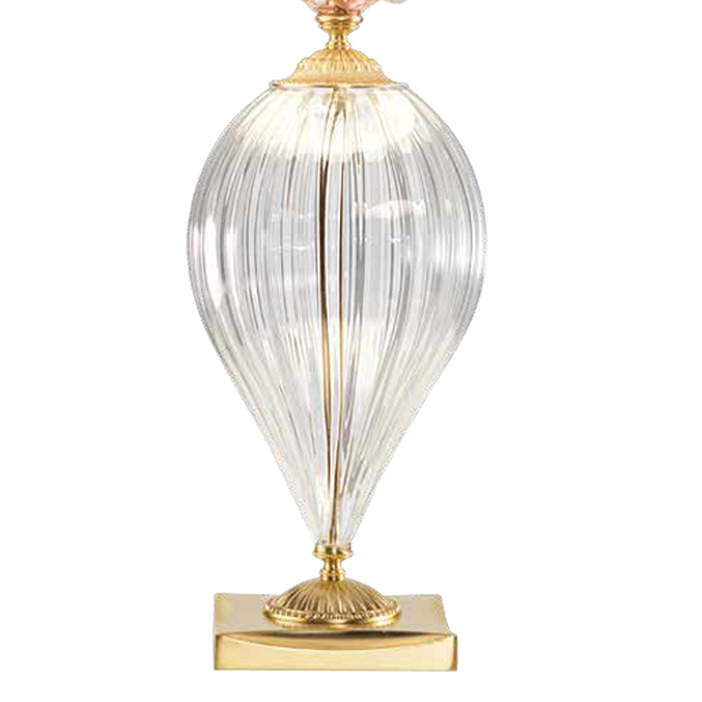Verfügbare Ausführungen:- Körper aus transparentem Glas - Details aus roséfarbenem Glas - Lampenschirm aus satiniertem Goldmetall und Champagner;