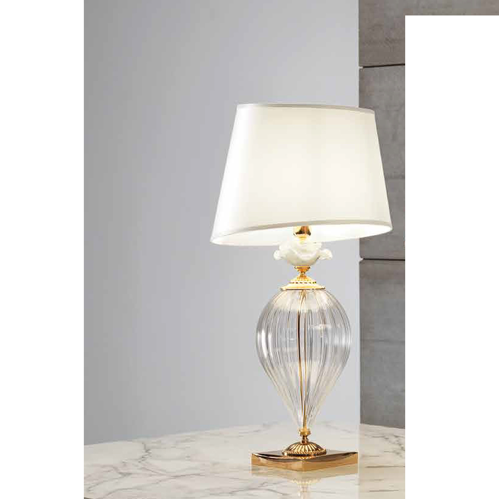 Tischlampe aus handgefertigtem Glas mit Kristalldekoration, Luxus made in Italy.