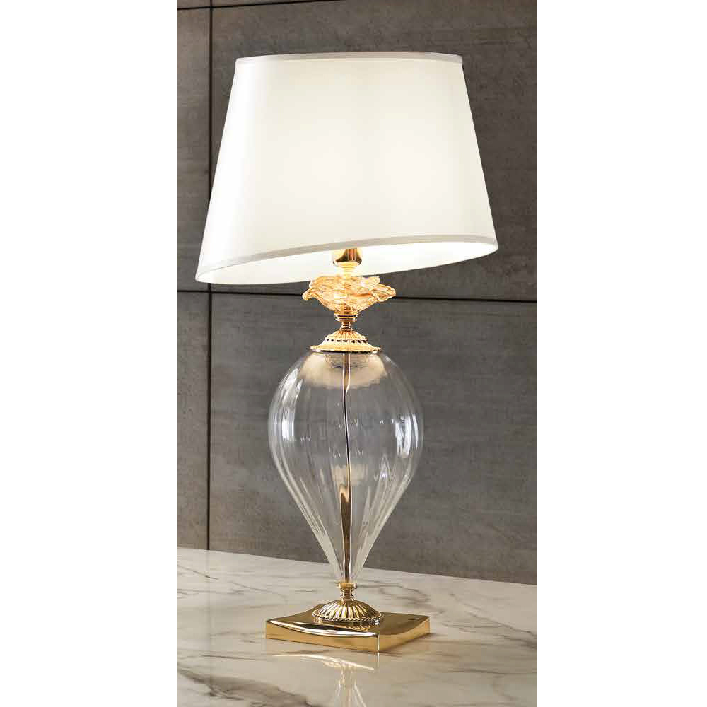 - Transparenter Glaskörper - honigfarbene Glasdetails - glänzendes Goldmetall und cremefarbener Lampenschirm.