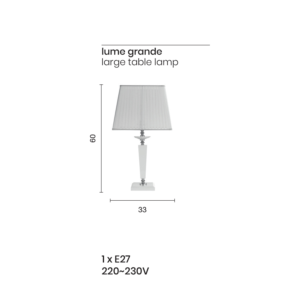 Diese Tischlampe ist in der Lage, die Umgebung zu charakterisieren und besteht aus einem weißen quadratischen Sockel , zwei quadratischen Elementen aus handgefertigtem weißem Glas und einem weißen Stofflampenschirm mit Falteneffekt.