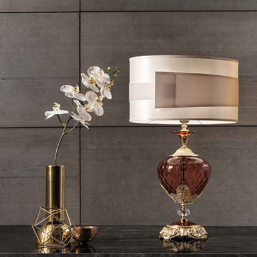 Die Tischlampe mit Lampenschirm ist ein luxuriöses Beleuchtungszubehör , das vollständig in Italien aus handgefertigtem Glas von höchster Qualität hergestellt wird und sich durch den besonderen ovalen Abschnitt der Arme auszeichnet.