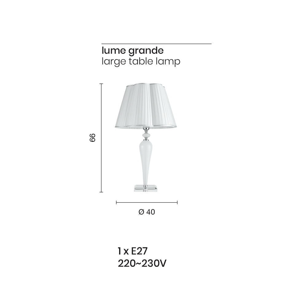 Diese Tischlampe hat ein klassisches, raffiniertes und elegantes Design, bestehend aus einem Sockel aus Kristall und zylinderförmigen Elementen aus handgefertigtem Glas , die die Struktur der Lampe bilden. Die kleinen Details und die Lampenfassungsabdeckung bestehen aus verchromtem oder goldenem Metall ; während der Gänseblümchen-Lampenschirm aus weißem Stoff mit silbernen oder goldenen Oberflächen besteht.