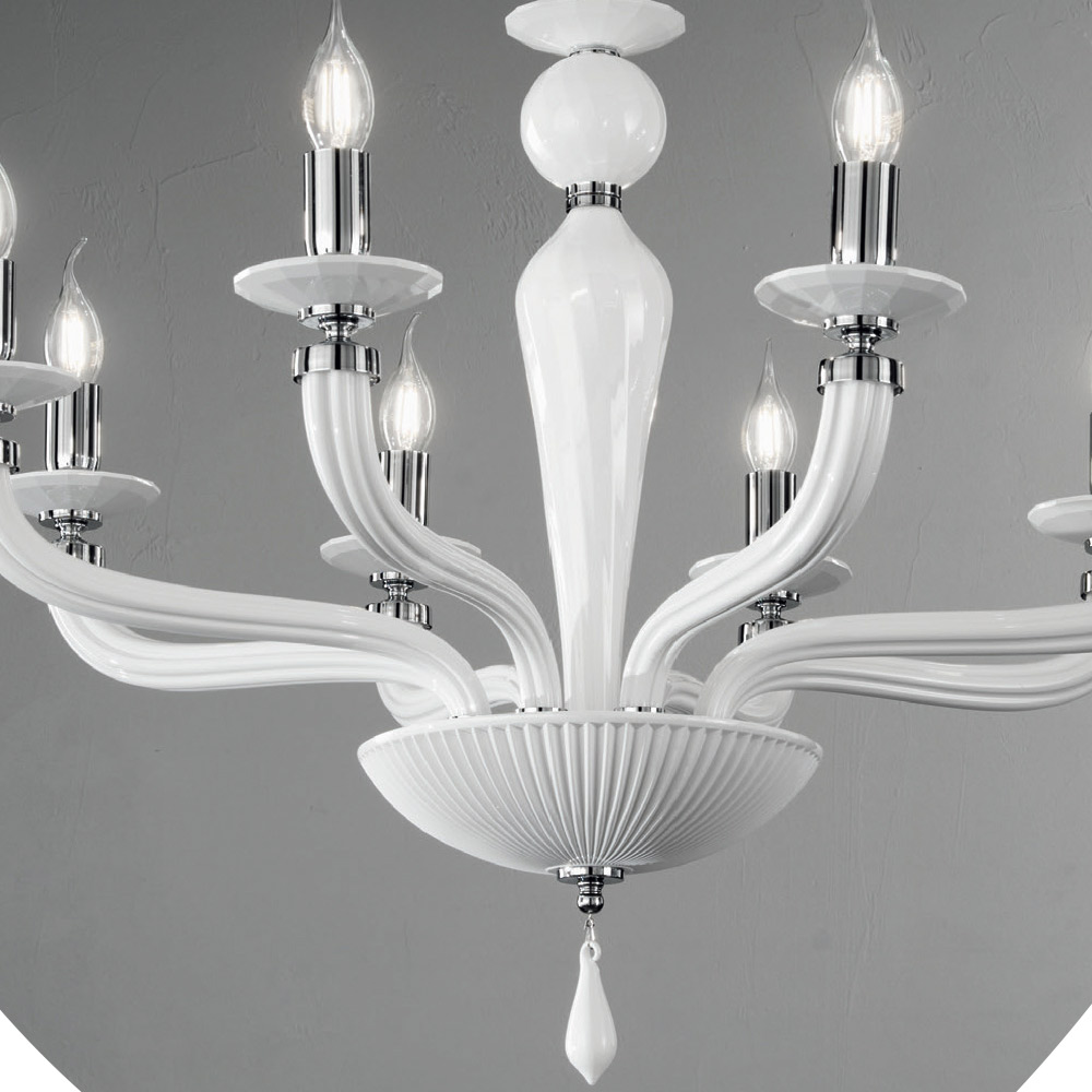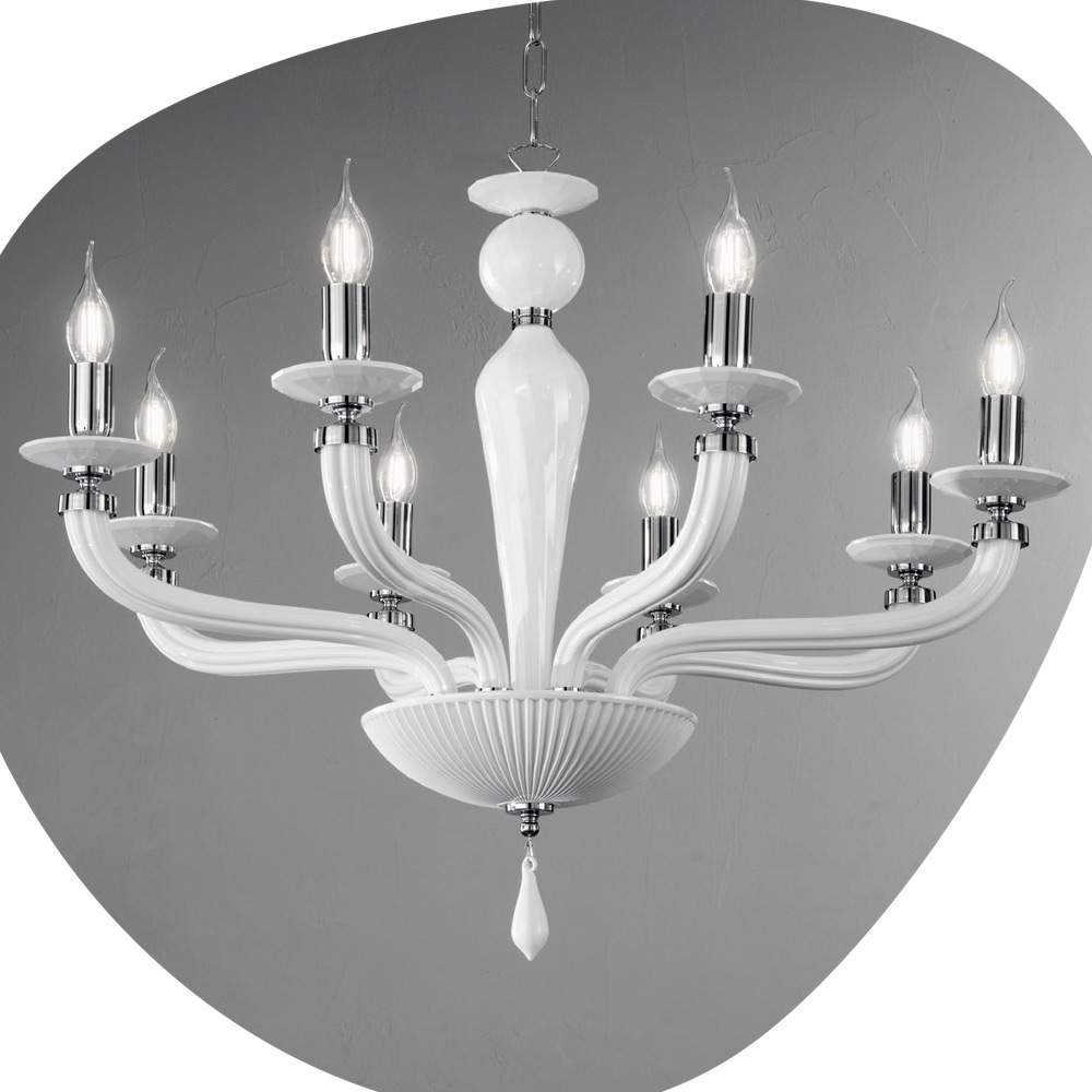 Dieser Hängeleuchter im klassischen Stil besteht aus 8 gebogenen Armen aus handgefertigtem Glas in Italien mit „Rigaton“-Effekt in Bernsteinoptik, die die Untertassen mit den Lichtquellen tragen.